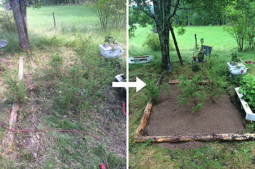 Efter en första grovrensning såg det ut som till vänster. Efter en semestervecka i lunkets tecken ser det nu ut som till höger.