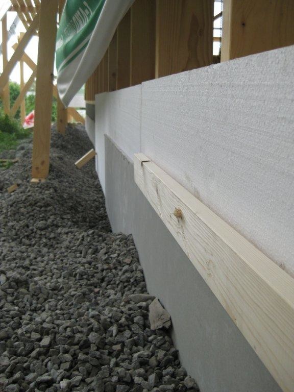 Den trycker du ner i ett färdigsågat spår. Bredden på klacken låg på 200 mm vilket passade bra för min vägg. Det är nog inte omöjligt att göra dessa spår själv om du önskar en annan bredd. Jag skulle dock kontakta tillverkaren och höra om de inte kan göra detta direkt vid tillverkningen. Jag funderade innan beställning på att ha 50 mm mer cellplast på utsidan än vad detta element har som standard och det var inga problem att fixa vid tillverkningen. Nu föll valet ändå på ett standardelement.