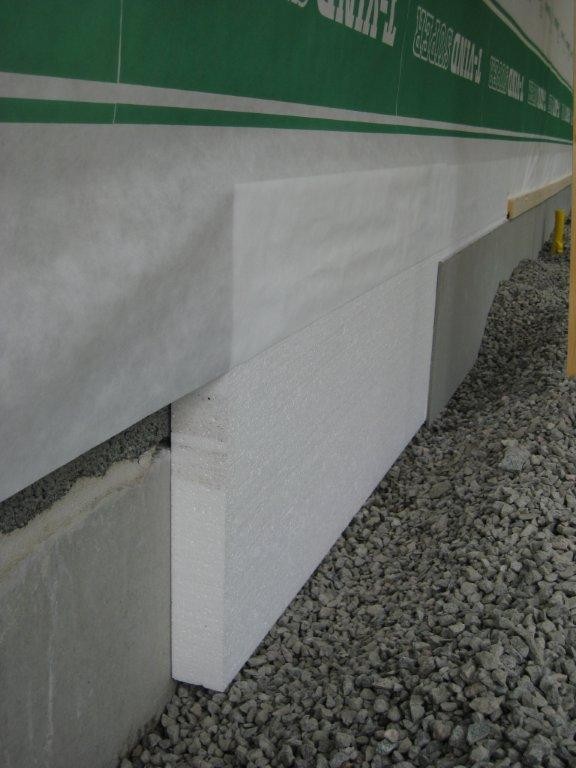Jag använde vanliga 400 L-element och på plattan ställde jag ett varv med 25cm leca. Syllen fixeras med M10 gängstänger som sitter i plattan (med kemankare) och sticker upp mellan lecablocken. Utanpå leca/kantelement/syll så sitter det 70mm cellplast för att bryta alla köldbryggor, slutligen sitter det en 8mm mineritskiva ytterst.