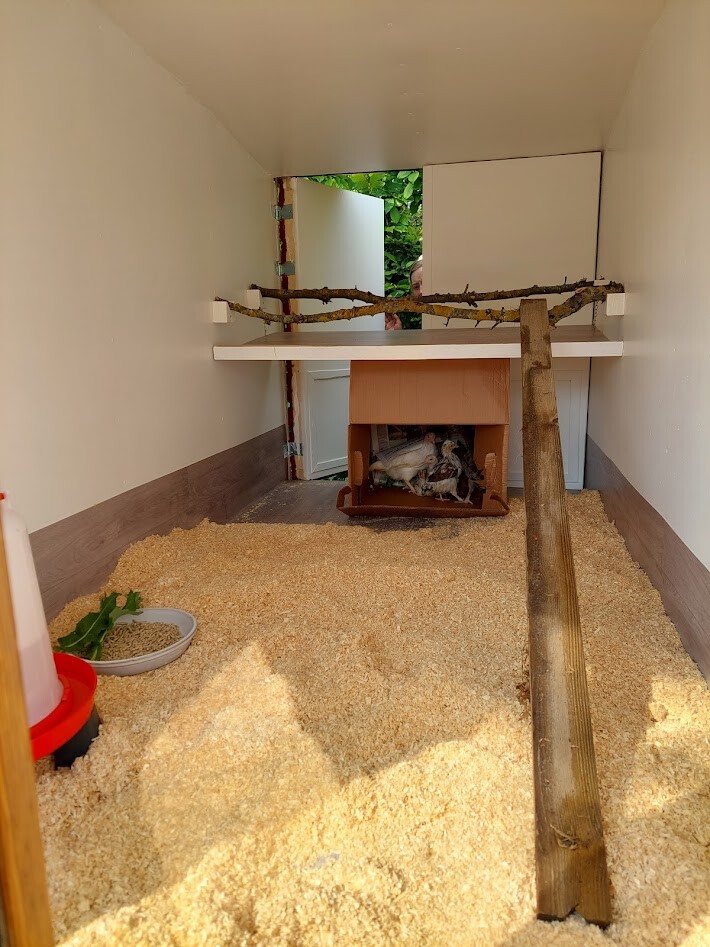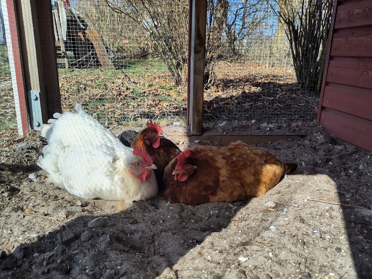 Vi har våra tre damer i ett mindre hus än så, men då har vi en utegård de alltid kan vara i, vilken de i princip alltid är i. (Från början var de sex, men två dog i Mareks och en var en tupp som blev aggressiv)