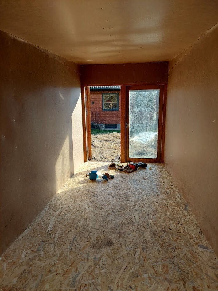 Väggarna invändigt klädde vi i OSB och målade med vita högglansfärgrester som vi fått av släkt och vänner. Vi byggde ett slätt golv av spånskiverester och på det satte vi en våtrumsmatta som vi fått köpa billigt som är lätt att torka av.
