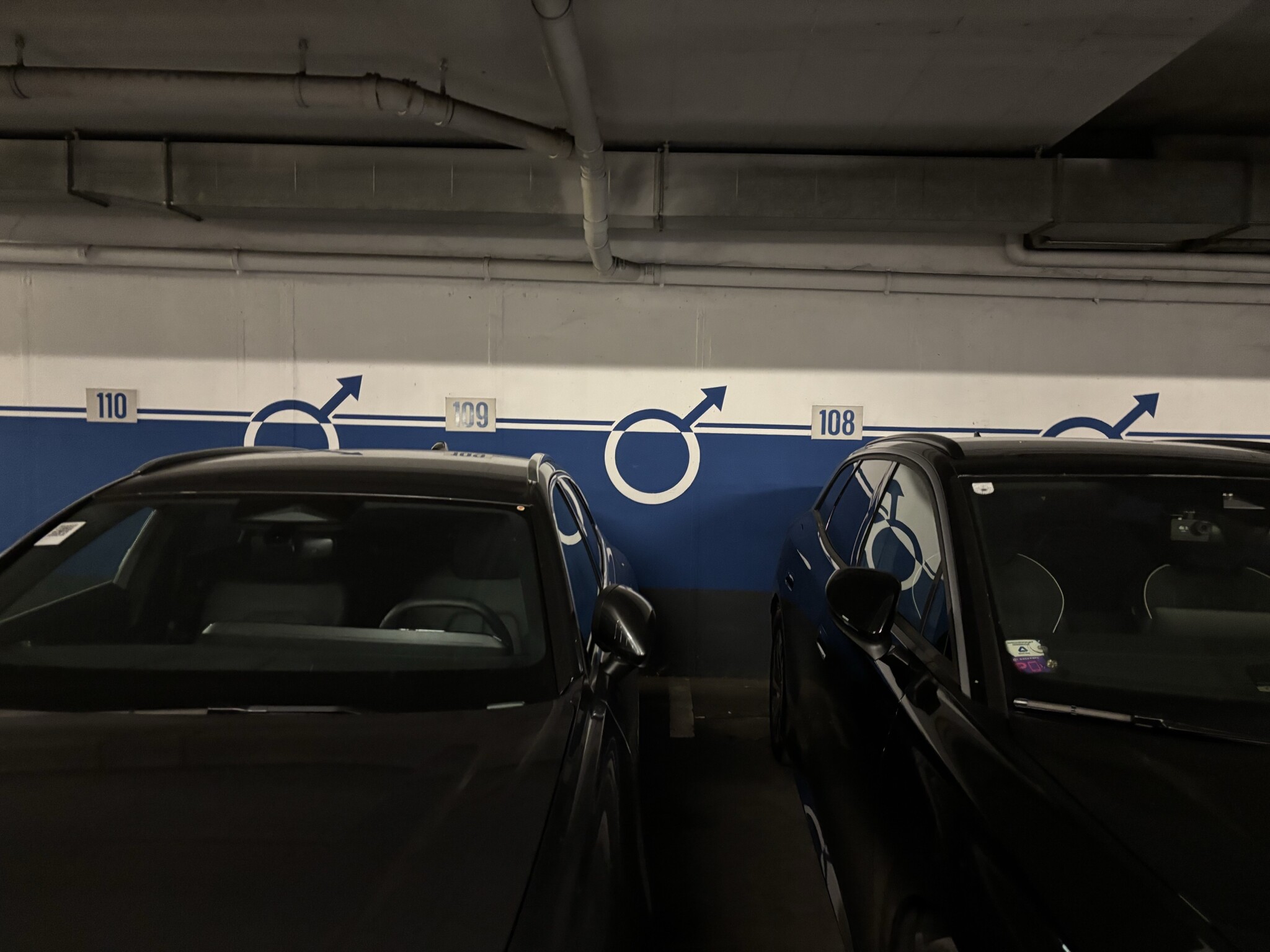 Humor från verkligheten. Tog kort i parkeringsgaraget under hotellet i Nürtingen tidigare i veckan. Det var två alt fyra rutor mellan stolparna!