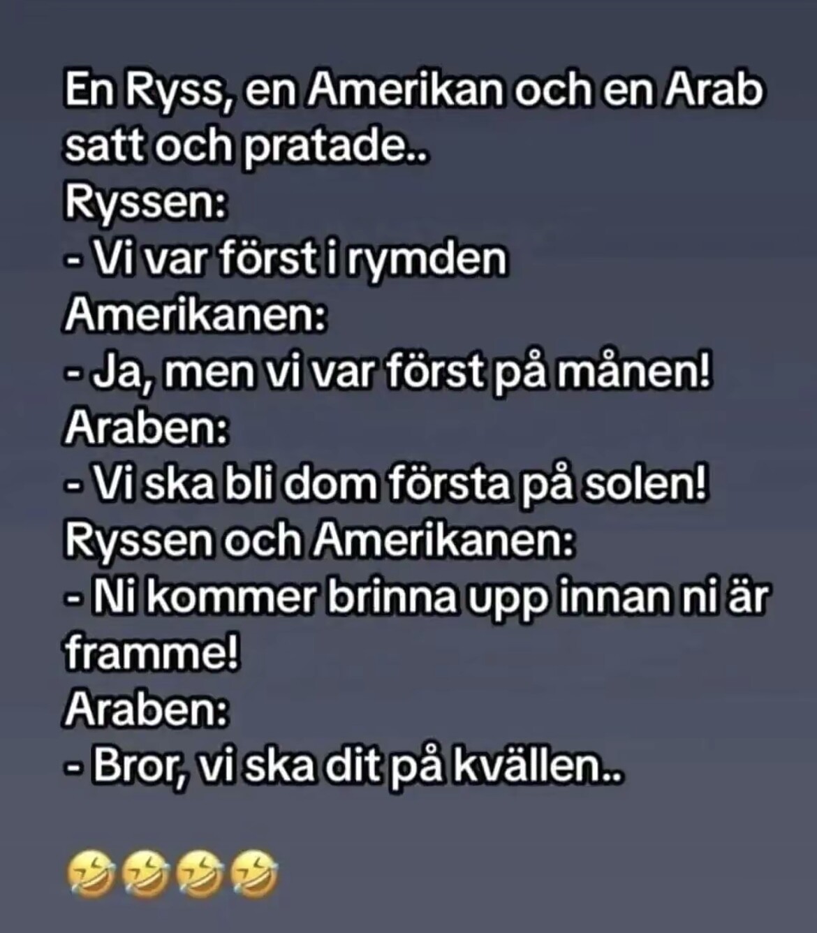 Ska man vara krass är ju "norrmannen" en människa från ett land.. här har man två länder och något som inte ens är ett homogent folk. Varför skulle "araben" åka till solen, vem betalar för det?mexitegel skrev: