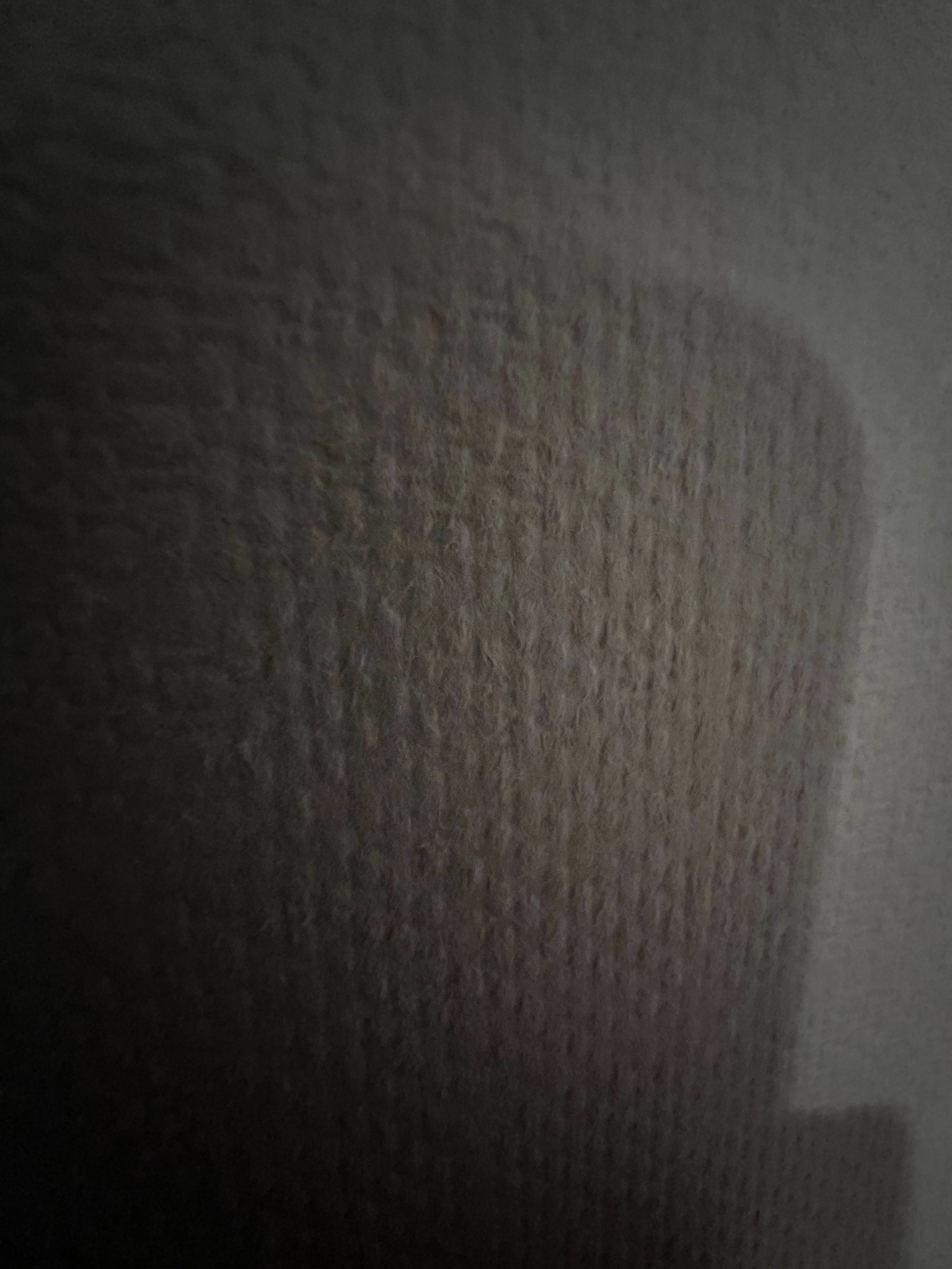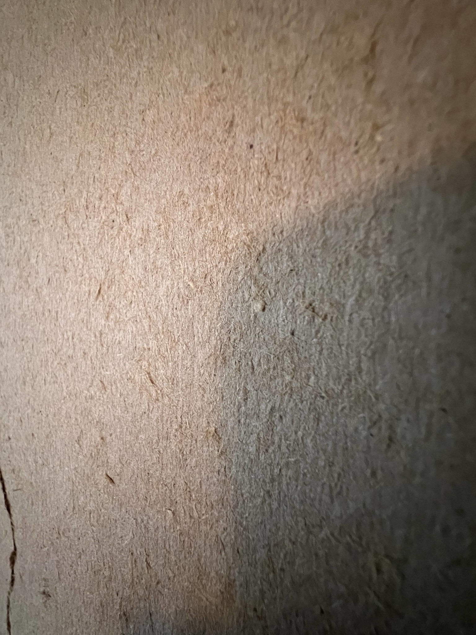 Notera den vita fläcken. Det är gips. Så frågan är, innan jag börjar gå för långt, hur långt behöver jag gå här? Limmet är ganska poröst och lossnar lätt om jag gnuggar lite med fingret. Den bruna pappen (ytterligare nån tapet?) är inte slät, men nära inpå. Kanske lite ”luden”?