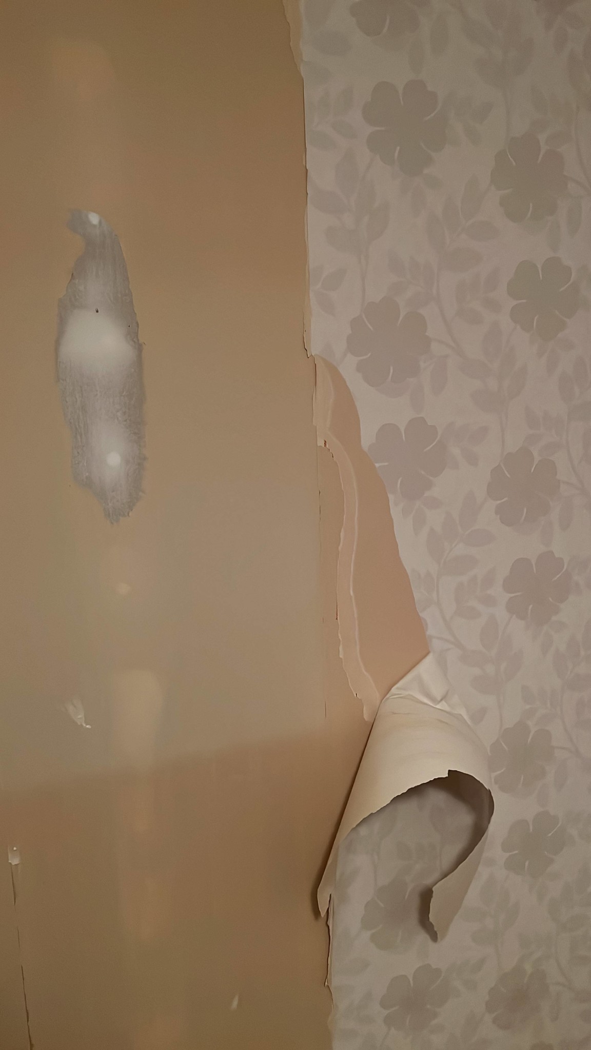 Vi köpte ett hus för ett tag sedan där vi nu tänkt tapetsera om. Det satt en vitgrå tapet där sedan innan, slät och fin så vi tänkte att det är väl bara att slänga på ny ovanpå. När vi sedan började så märkte vi att underlaget började lossna, både i form av bubblor men även större partier där man liksom märkte att det var löst. Vid närmare undersökning så visar det sig att det sitter strukturtapet under den befintliga, som förra ägarna bara tapetserat över. Sedan såg vi att under denna så fanns där även någon form av vävtapet. ”Gör om och gör rätt” blev ledordet så började skala bort, gick relativt enkelt.