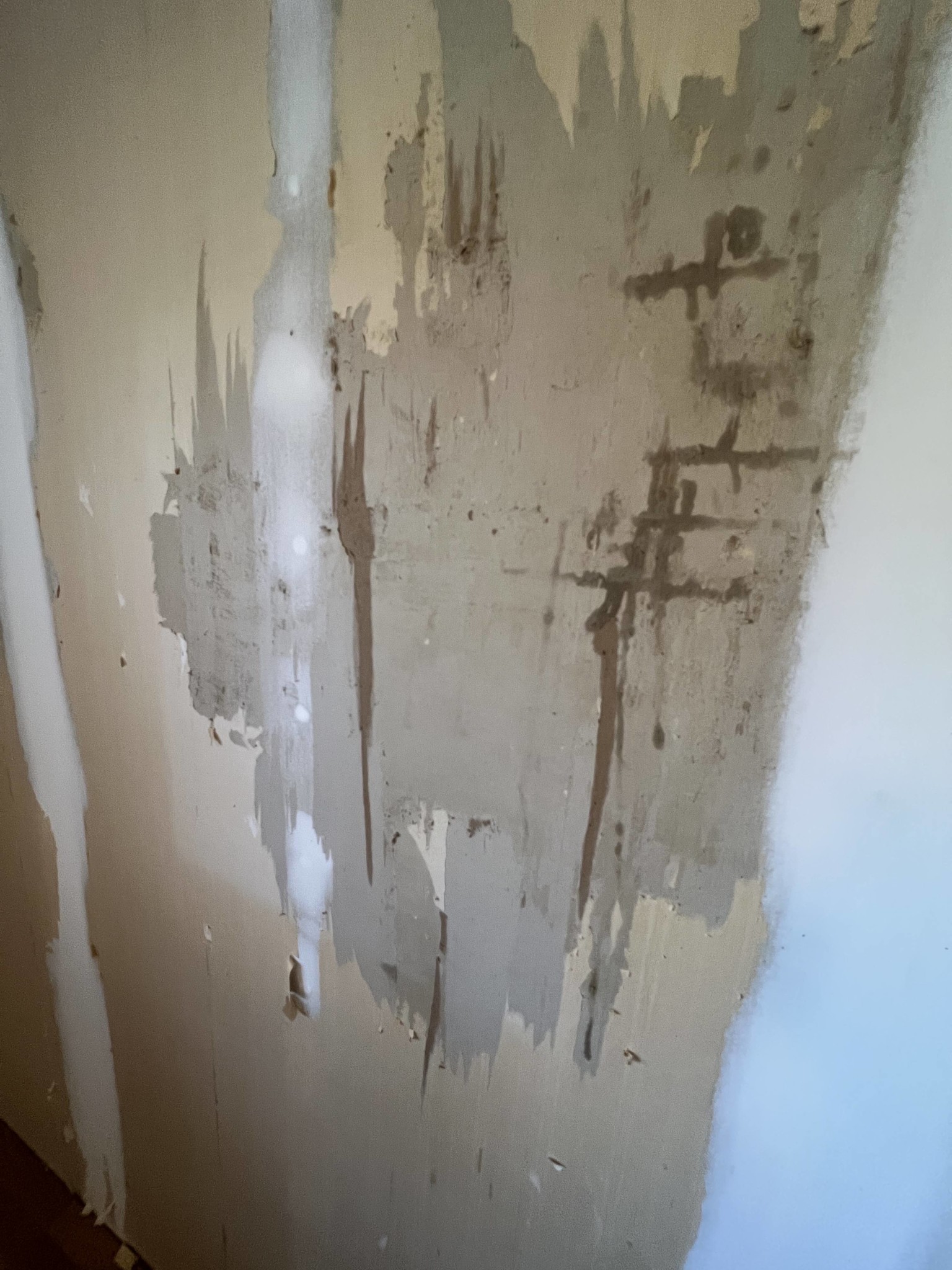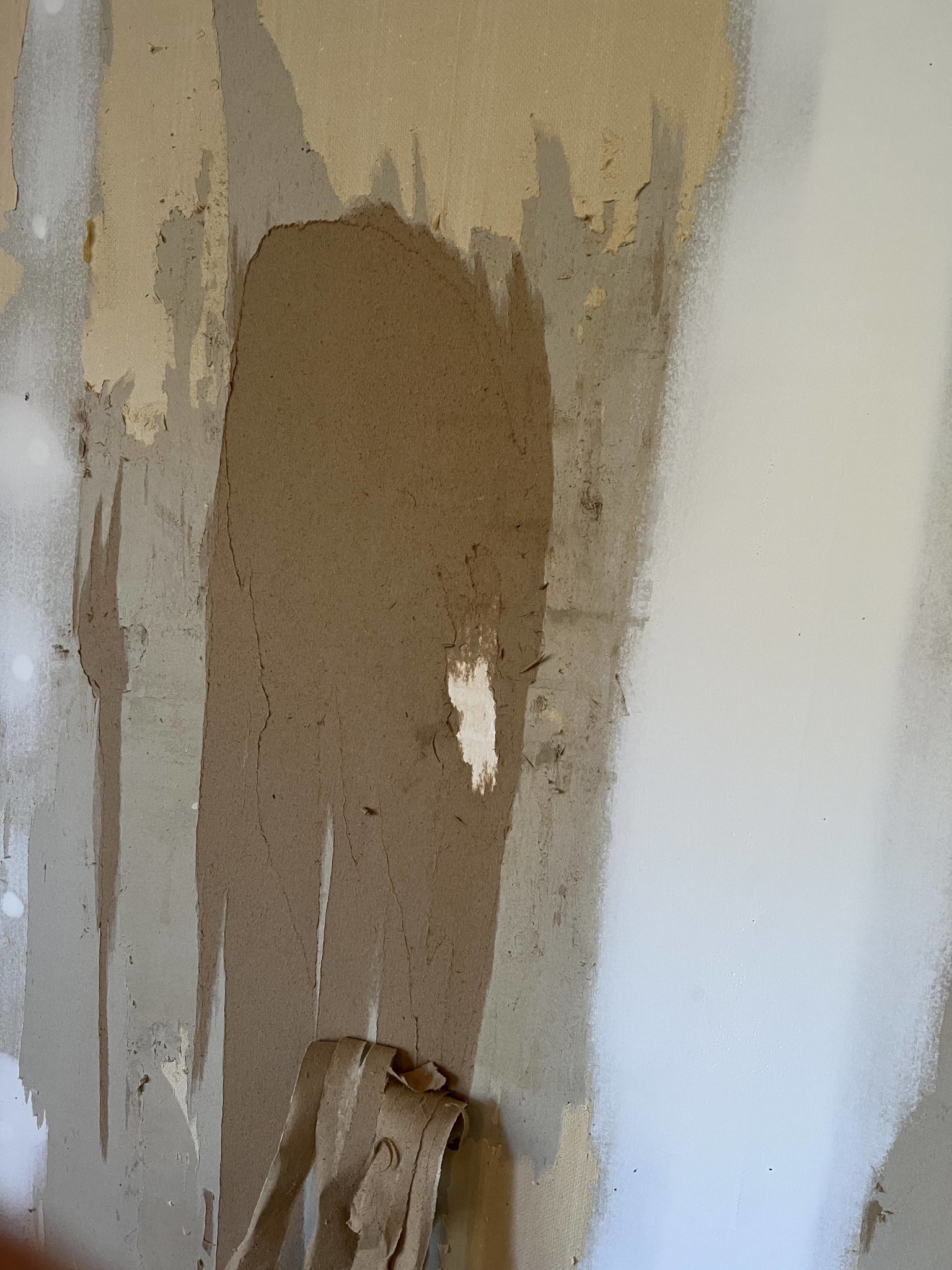 Efter att ha läst på så verkar det som att denna restprodukt inte går att tapetsera på, så bort med skiten! Sagt och gjort så började jag med lite vatten och skrapa få bort pappen. Under denna verkar det vara lim, det är i alla fall lite klibbigt. Och under limmet framkommer någon form av brun papp där gipsväggen dyker upp bakom.