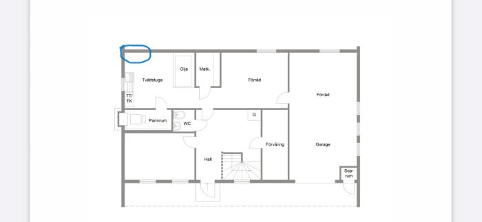 Sidan med buskarna vid stupröret är där tvättstugan är.