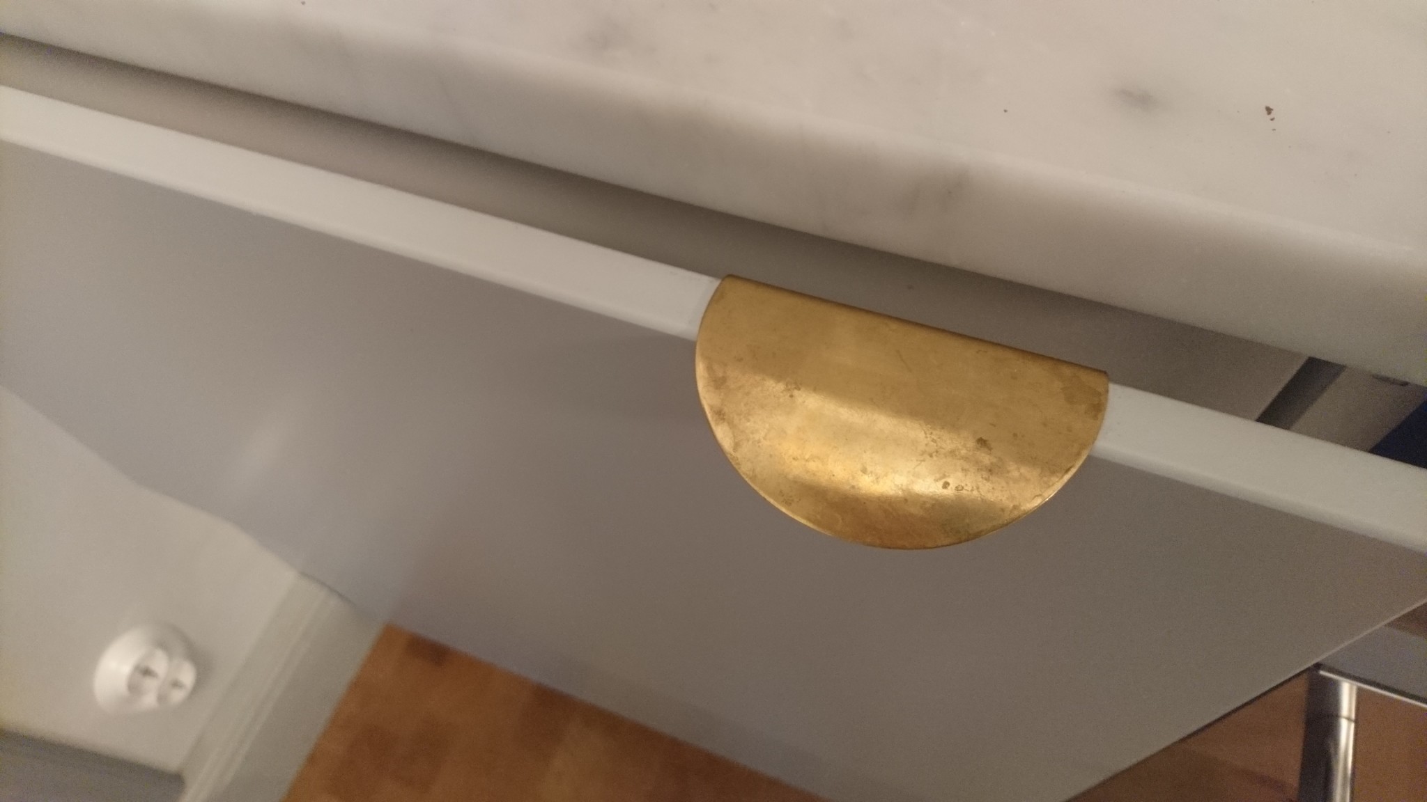Så här ser våra mässingshandtag ut efter fyra år. De är obehandlad mässing. Inga jack eller djupare märken, men plåten är ganska tjock. De har torkats vid städning, men aldrig putsats.
