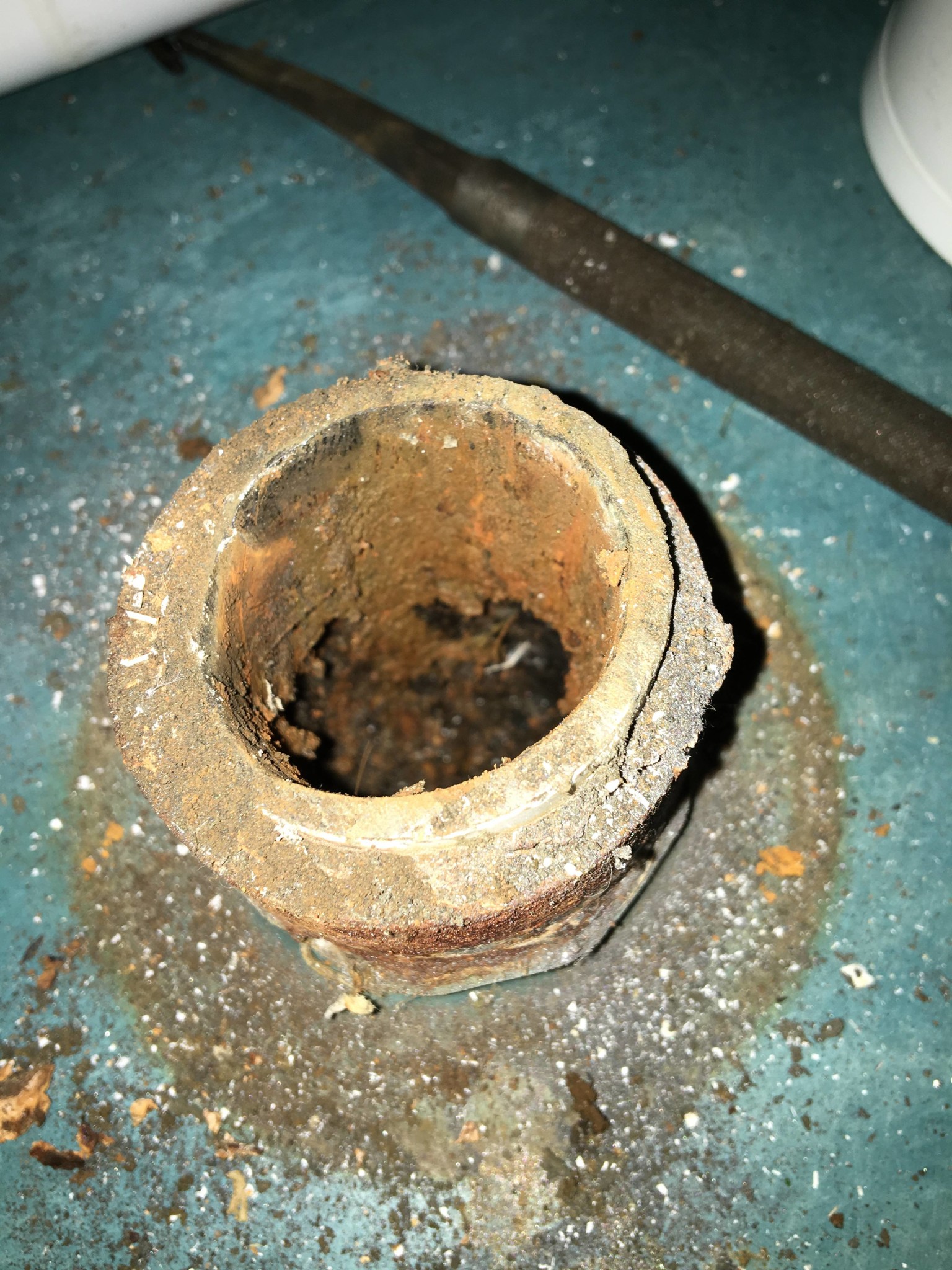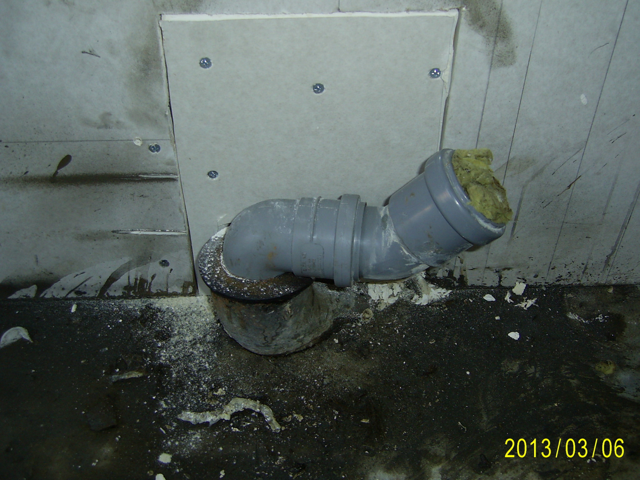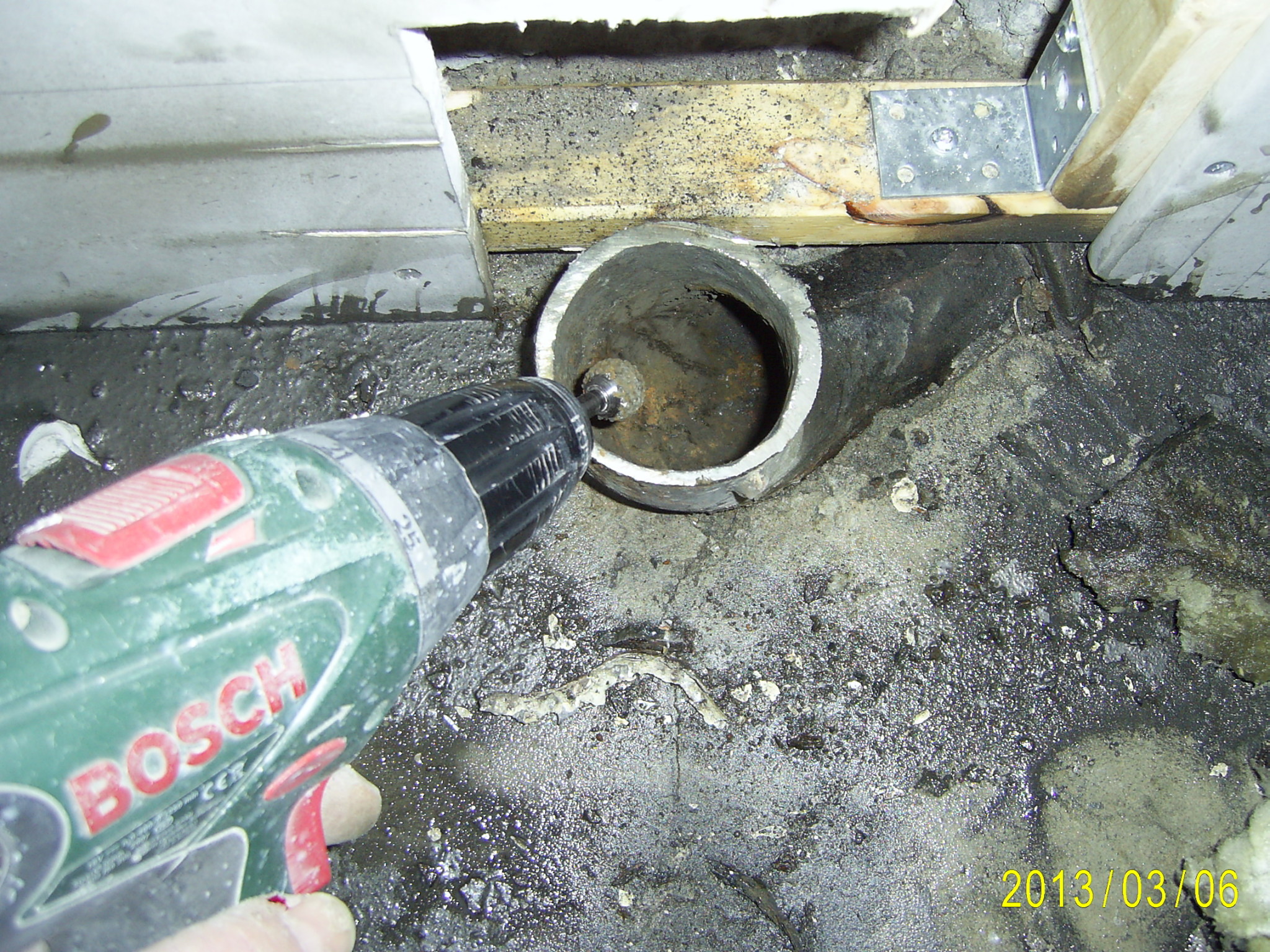 Det gamla röret kapades då det kom upp köksinredningen röret rengjordes med en roterande rasp, rätt gummistos monterades och sedan grå plast.