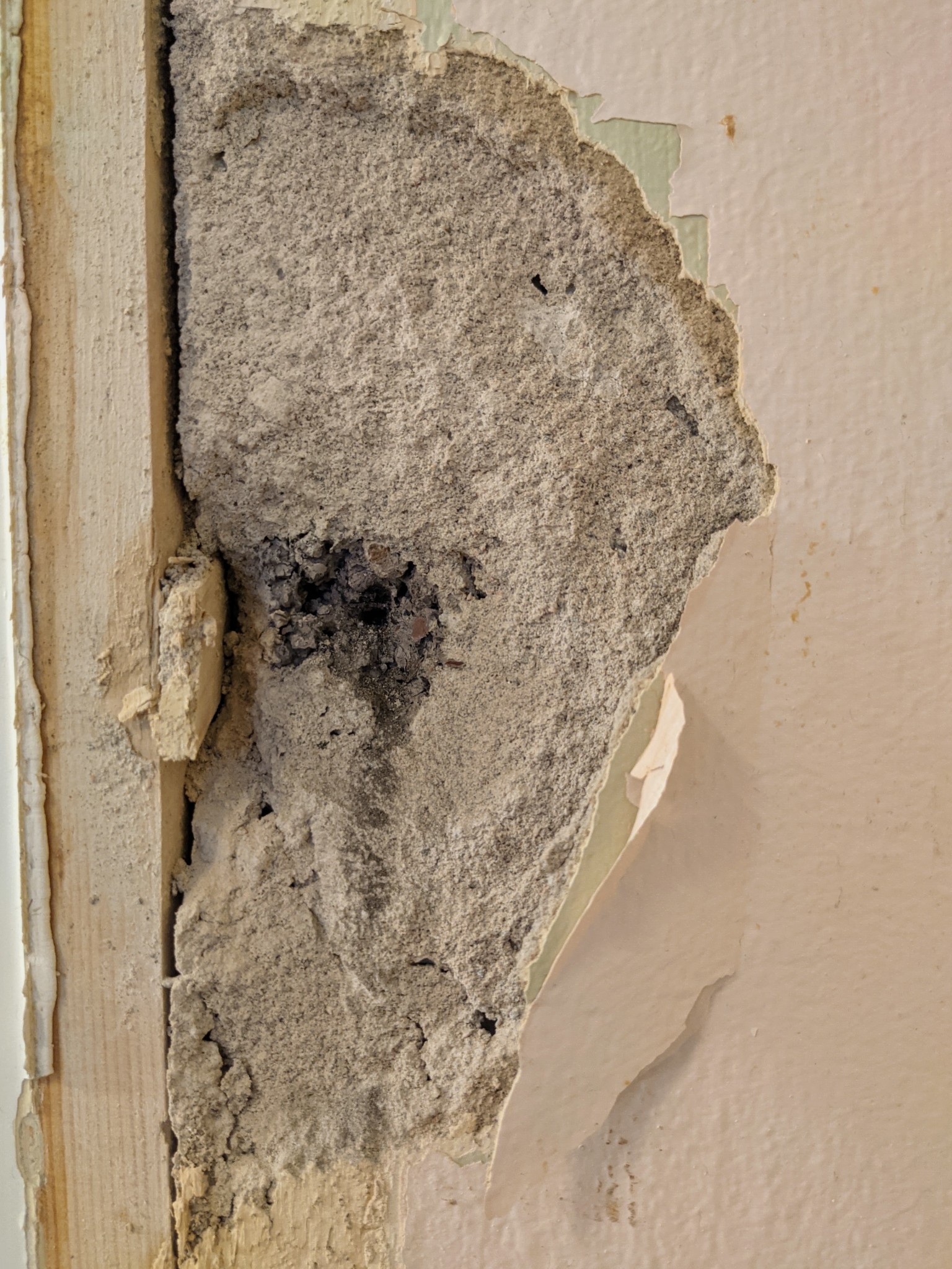 En av spikarna drog med sig lite material när jag höll på att avlägsna ett dörrfoder och lämnade lämpligt nog en liten krater som visar hela väggen i genomskärning. Så hur byggde man då? Vad är de olika lagren. Går det att se?