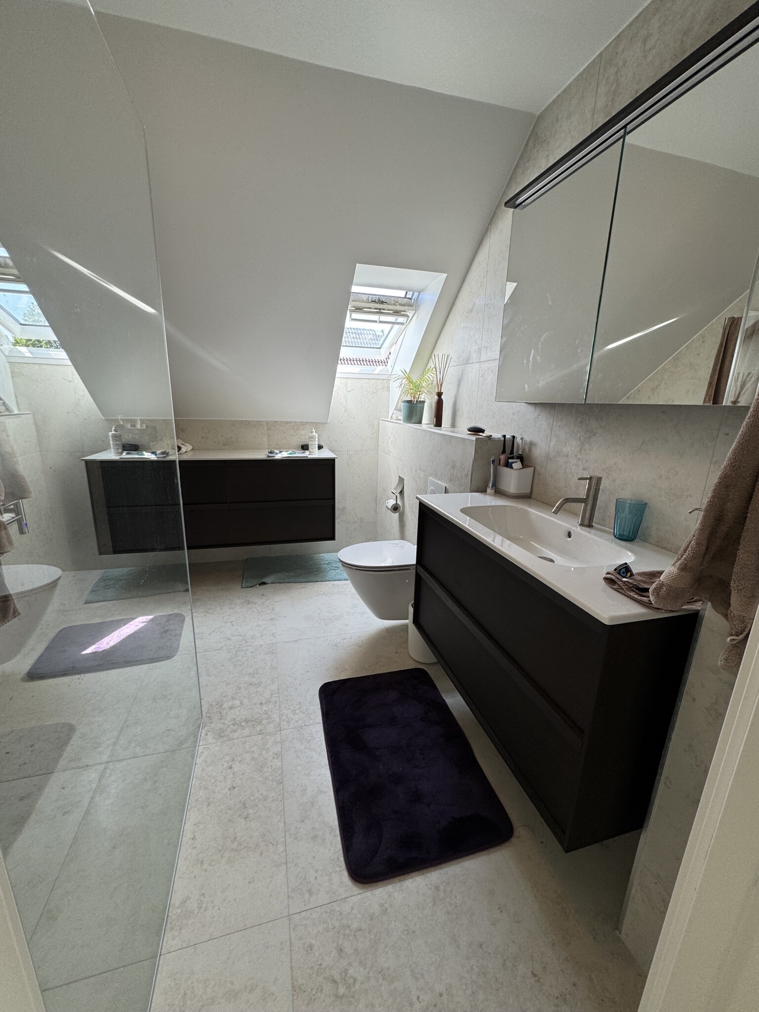 Vi har just gjort om vårt badrum i Tyskland (8 m2). Bort med gammalt kakel på golv och väggar. Nedsänkt tak med spottar, ny WC-stol, nytt, ny bidet, ut med det gamla badkaret, in med ny handikappsvänlig dusch 1x1.2m, duschväggar i glas, nya armaturer, naturligtvis tätskikt, spackling av golv och väggar kakel och kakling, el- och vvs arbete. Golvvärme och handukstork fanns.