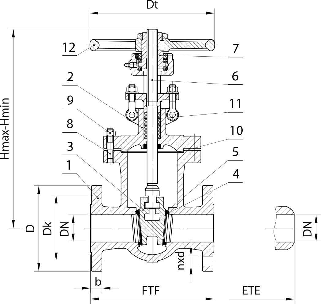 Ventilen kan vara en kil(slids)ventil/skjutventil, den är då uppbyggd på liknande sätt som följande,