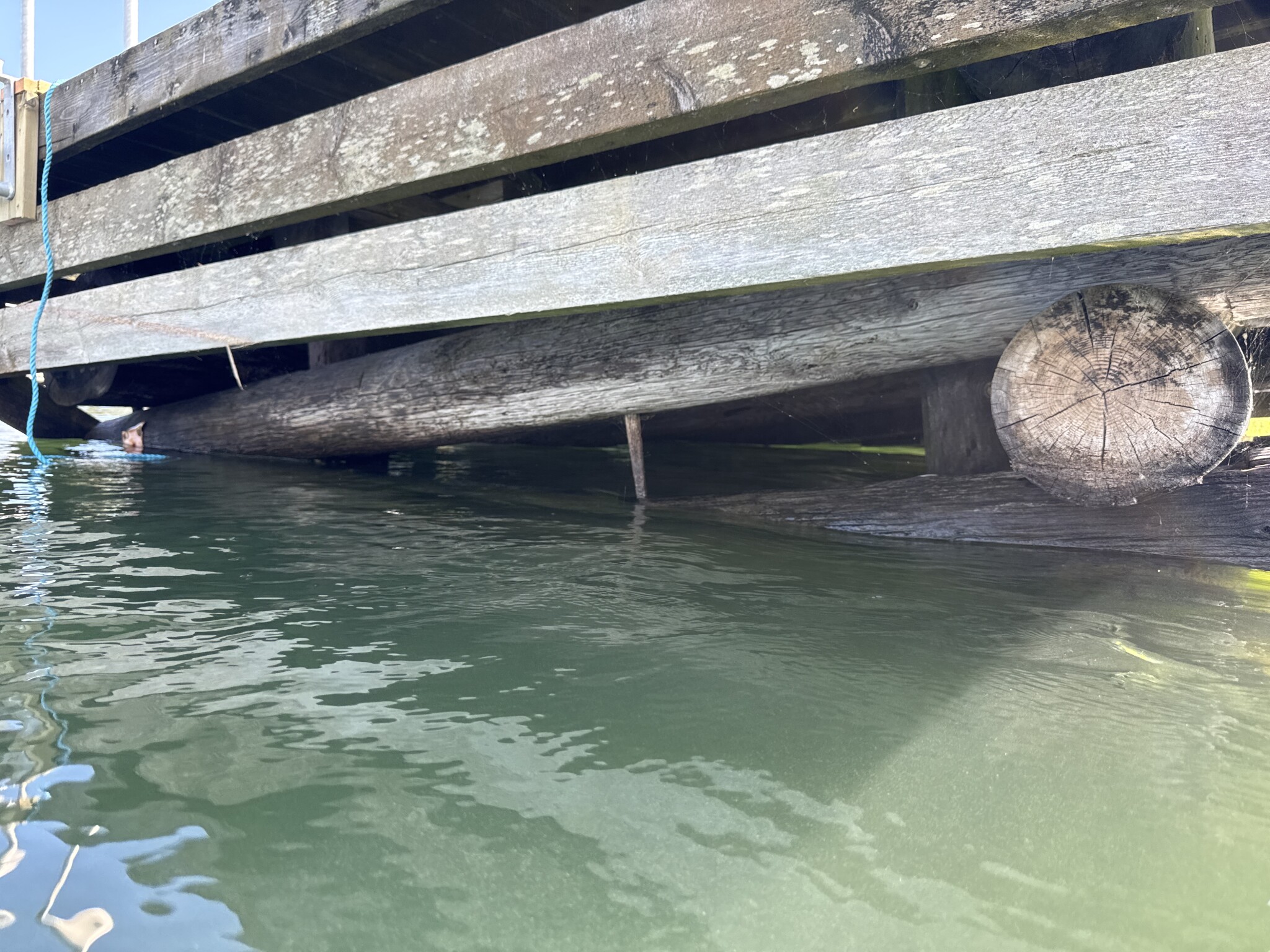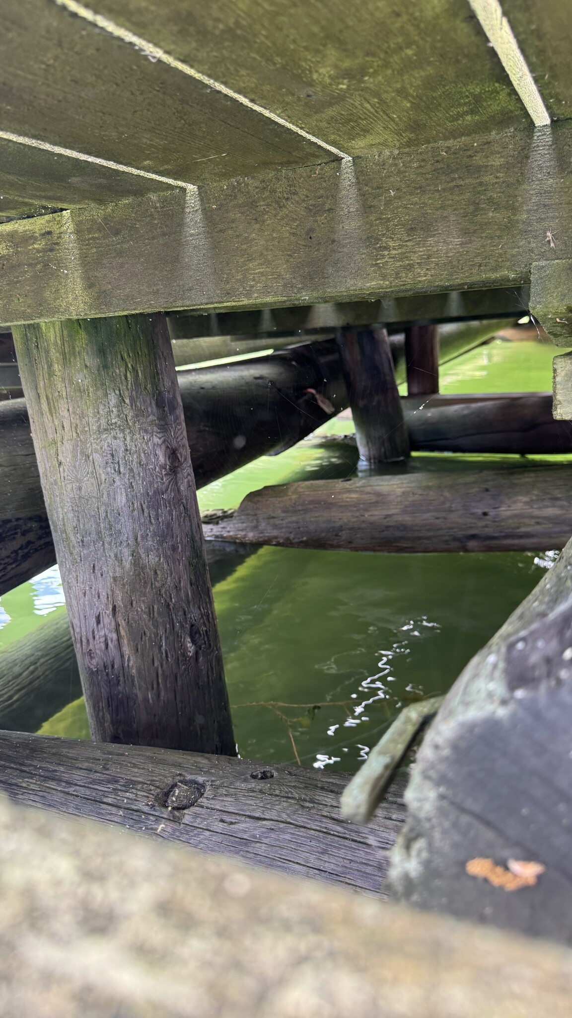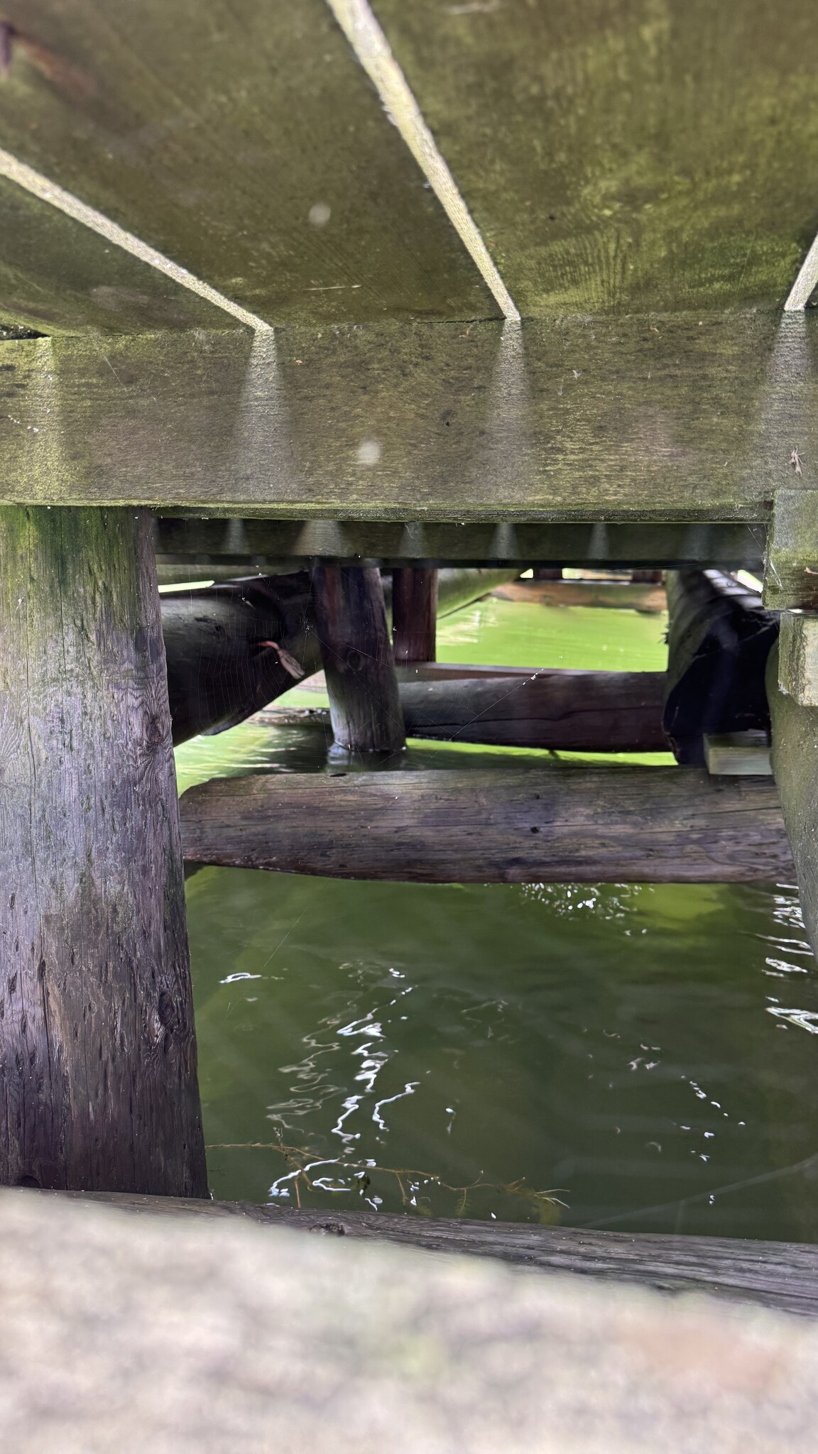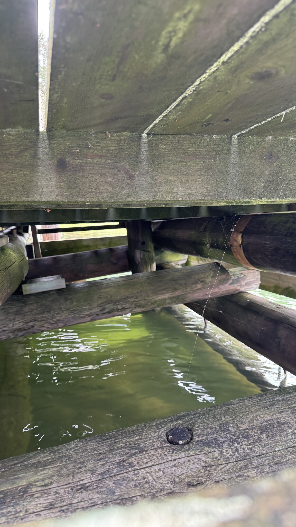 Jag har en träbrygga som vilar på en stenkista och den lutar snett, främst i ett hörn som verkar ha sjunkit. Efter att ha kollat under ser jag att några av de bärande stockarna är slitna eller ruttna, och att det ligger lösa kilar som håller upp delar av konstruktionen. Själva stenkistan ser okej ut men bär inte jämnt längre.