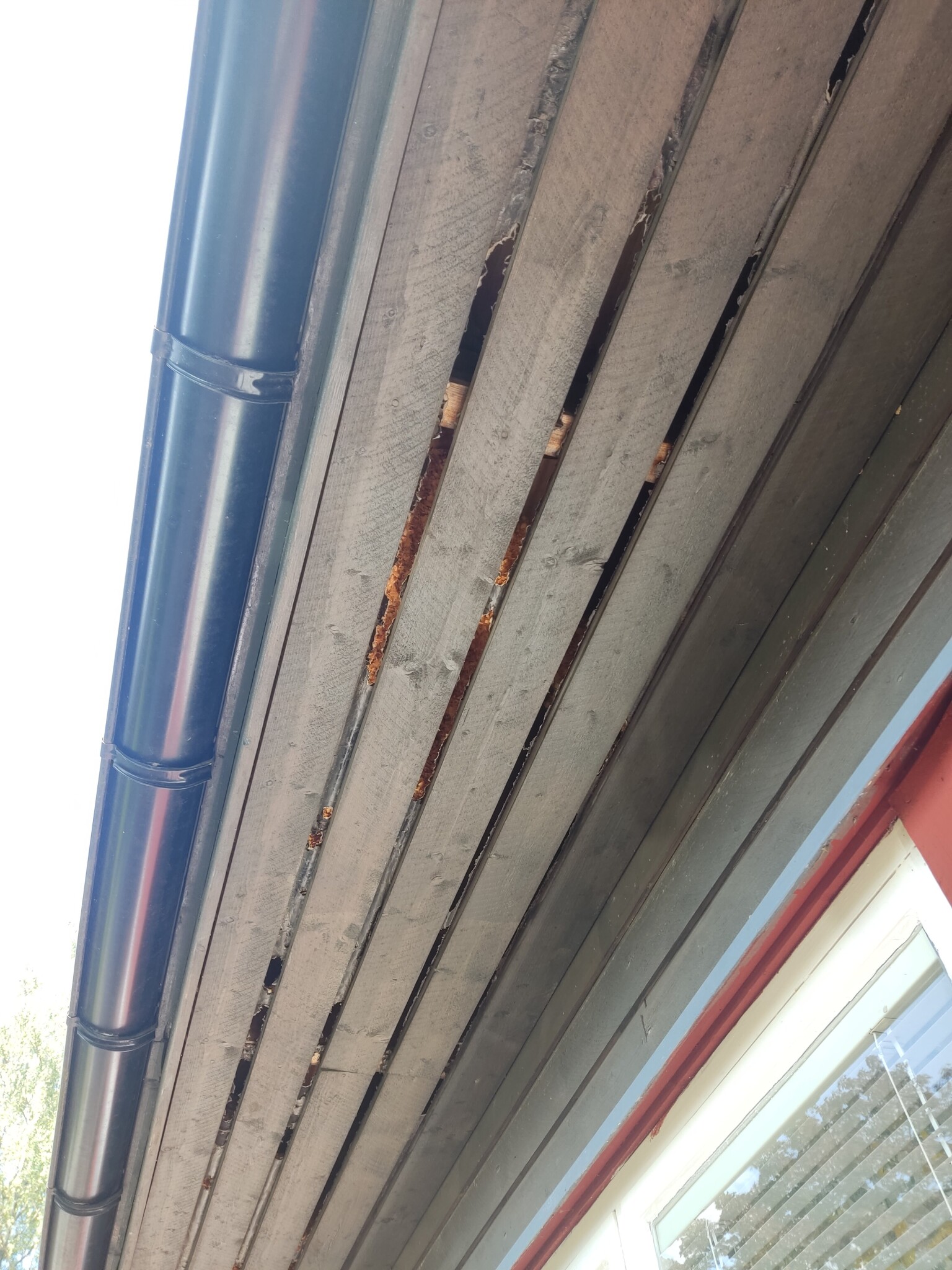 Min ambition är att åtminstone sätta fast nät för att hålla det spån som finns kvar inne och djur och natur ute. Helst hade jag gjort detta från insidan, dock är möjligheter att nå fram till takfoten längs husets långsidor från vinden väldigt begränsad med bara några centimeters glipa ned mot takfoten förutsatt att jag inte ger mig i kast i att börja gräva i isoleringen och tar loss de spånskivor som håller den på plats ned mot takfoten