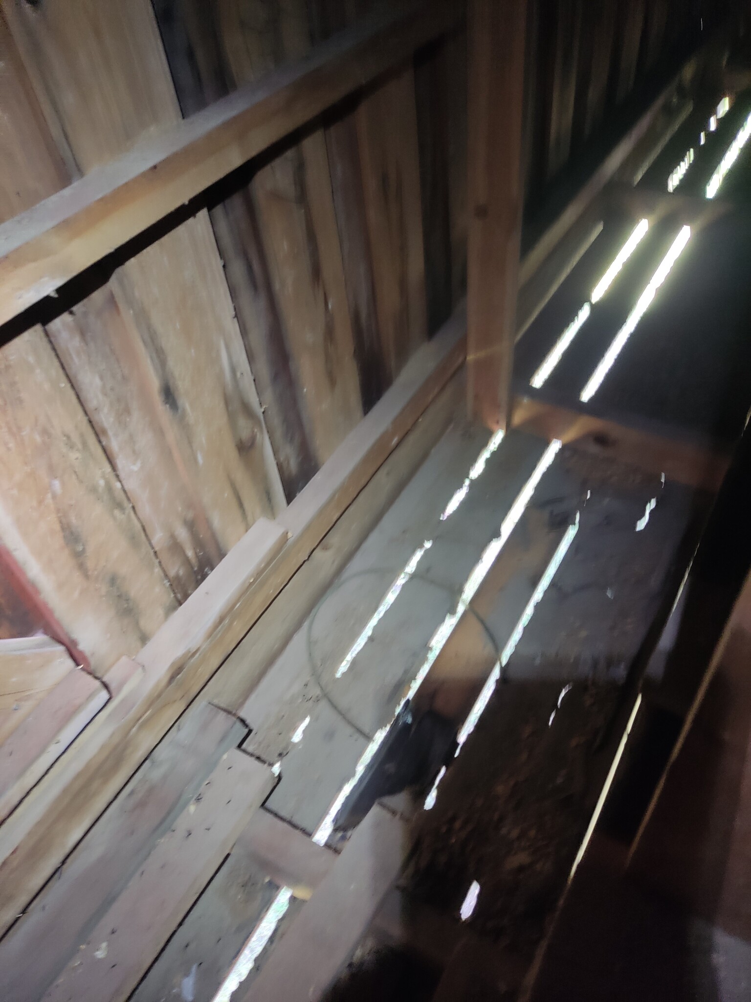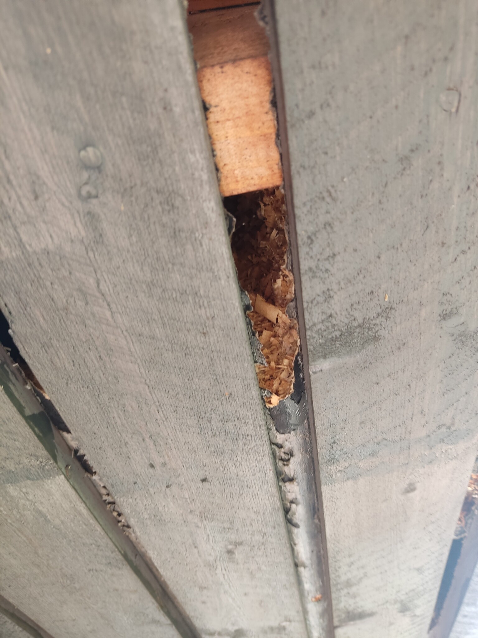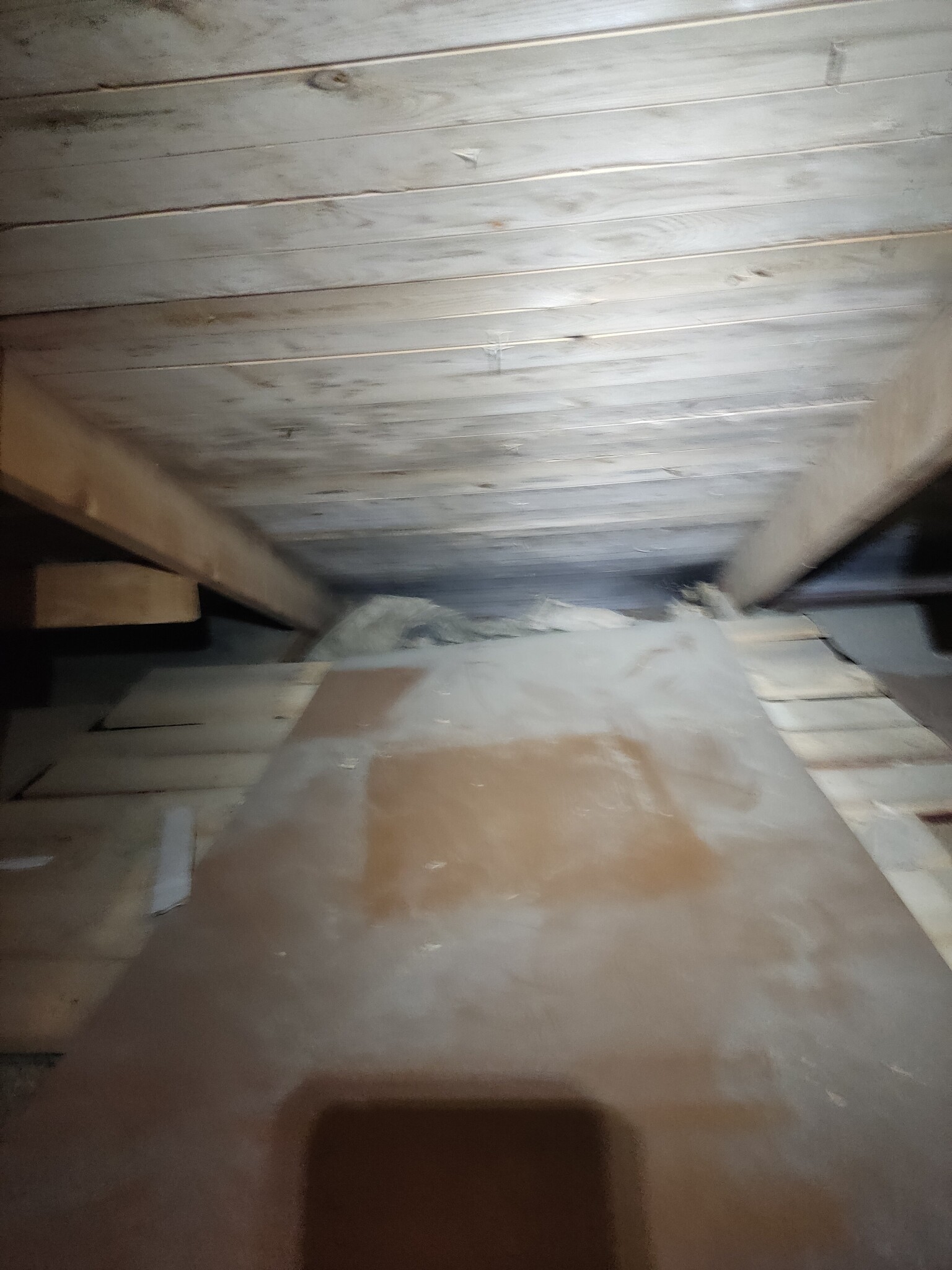 Jag bor sedan ett år tillbaka i en enplansvilla byggd under tidigt 70-tal. Runt huset har det då och då dykt upp ansamlingar med sågspån som tydligen härrör från takfoten. Som bilderna visar har det i tidernas begynnelse legat papp i botten och ett ca decimetertjockt lager spån ovanpå, vilket nu rasar iväg allteftersom pappen ger vika. Diverse djurliv får nu också fri lejd in och ut från vinden.