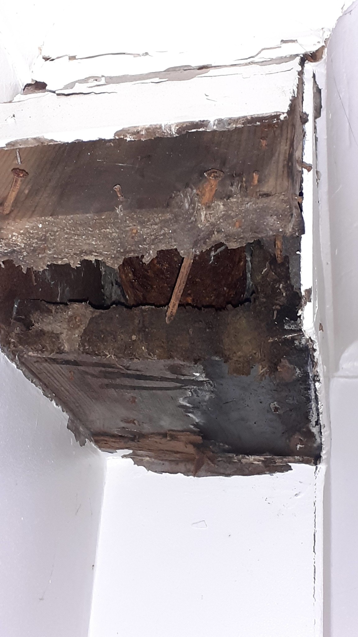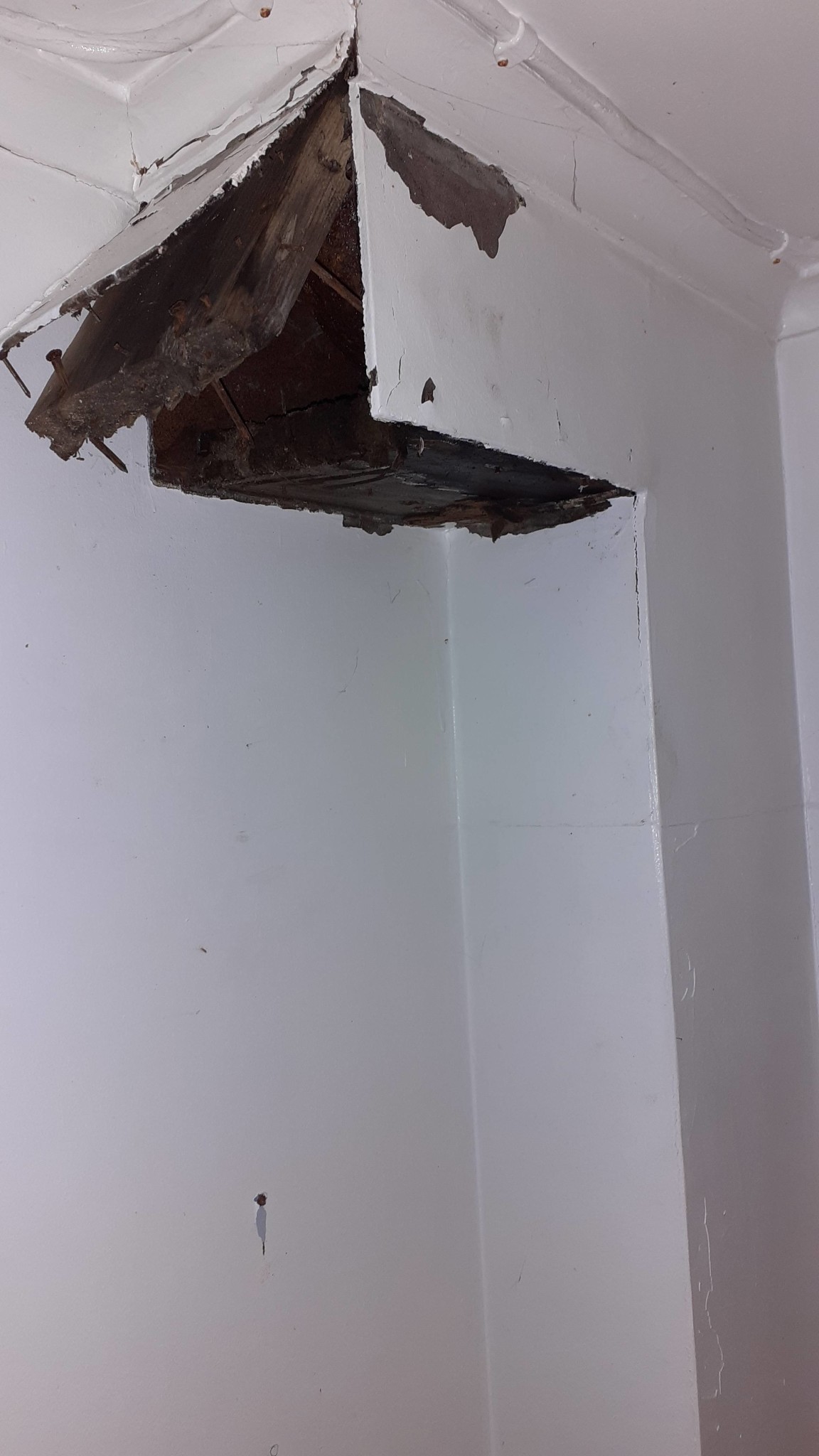 Det går ett avluftrör för avlopp från källaren till badrummet (inbyggd i ett hörn) och just under innertak tar röret en böj och sedan gör röret genom innertaket rakt upp mot vinden och sen genom yttertsket. Delen där det började droppa sitter precis under böjen.