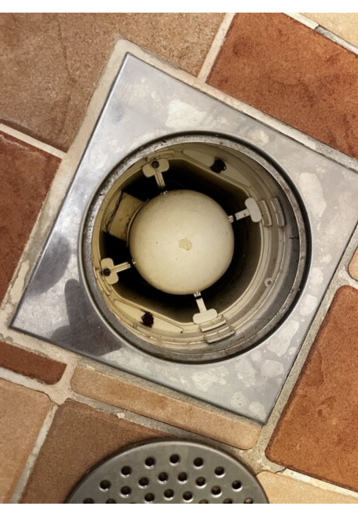 Men fortfarande en gammal antikvarisk golvbrunn som är från före 1990 och skulle ha bytts vid renoveringen.