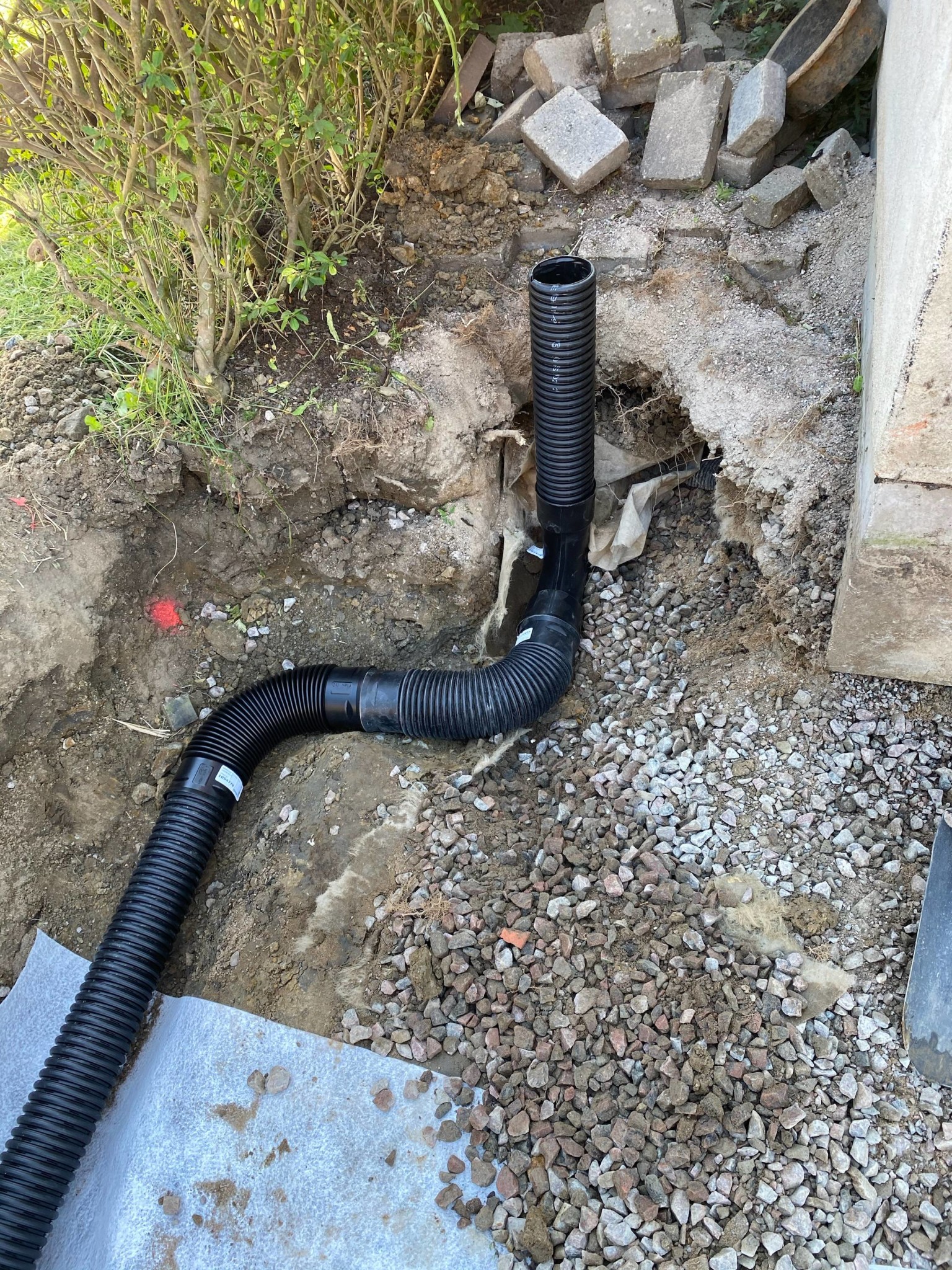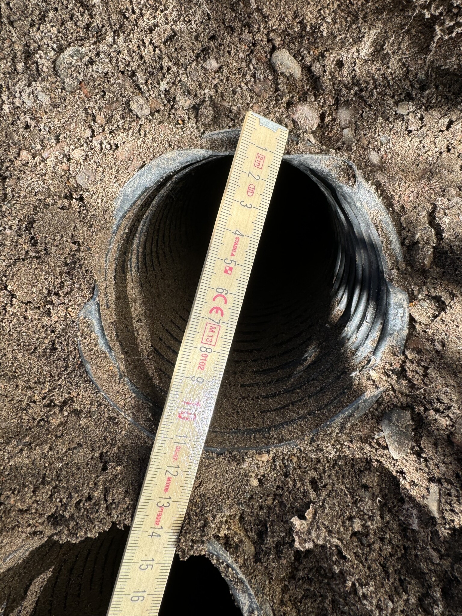 G-83, är detta ditt yrke? Jag har nämligen en relaterad fråga. Hur ska 110 mm dräneringsrör som ligger runt en betongplatta egentligen avslutas? Får dräneringsröret gå upp ur marken och användas som spolrör? Är igång med att bygga uterum och killarna som lagt ned dräneringsrör runt uterummets betongplatta (som ligger intill husets betongplatta) har kopplat ihop det nya röret runt uterummet med husets gamla rör. På varsin sida om nya plattan har de låtit dräneringsrören gå upp ur makadamen med avsikten att de ska kunna användas som spolrör. Är detta ett riktigt tillvägagångssätt eller borde man ha använt riktiga avloppsrör den sista biten istället (med en markrörspropp som avslutning). Se andra bilden. Har för mig att jag läst någonstans att man ska undvika att ha dräneringsrör i markytan med risk för att röret riskerar att bli fyllt av jord/lera och på sikt sätta igen systemet. Borde de istället ha avslutat med slätände, skarvmuff och propp istället? Eller ett spolrör (se tredje bilden)?