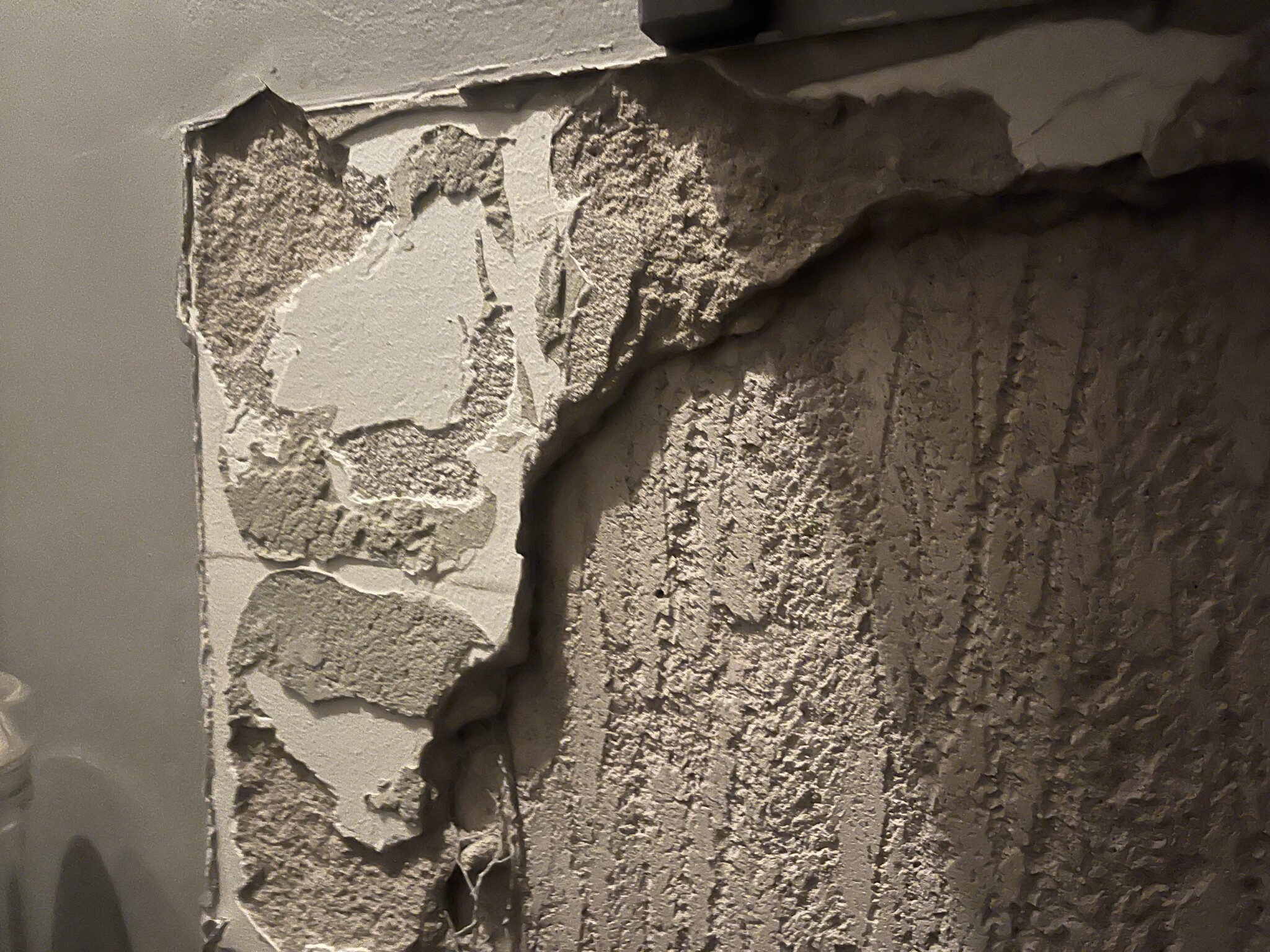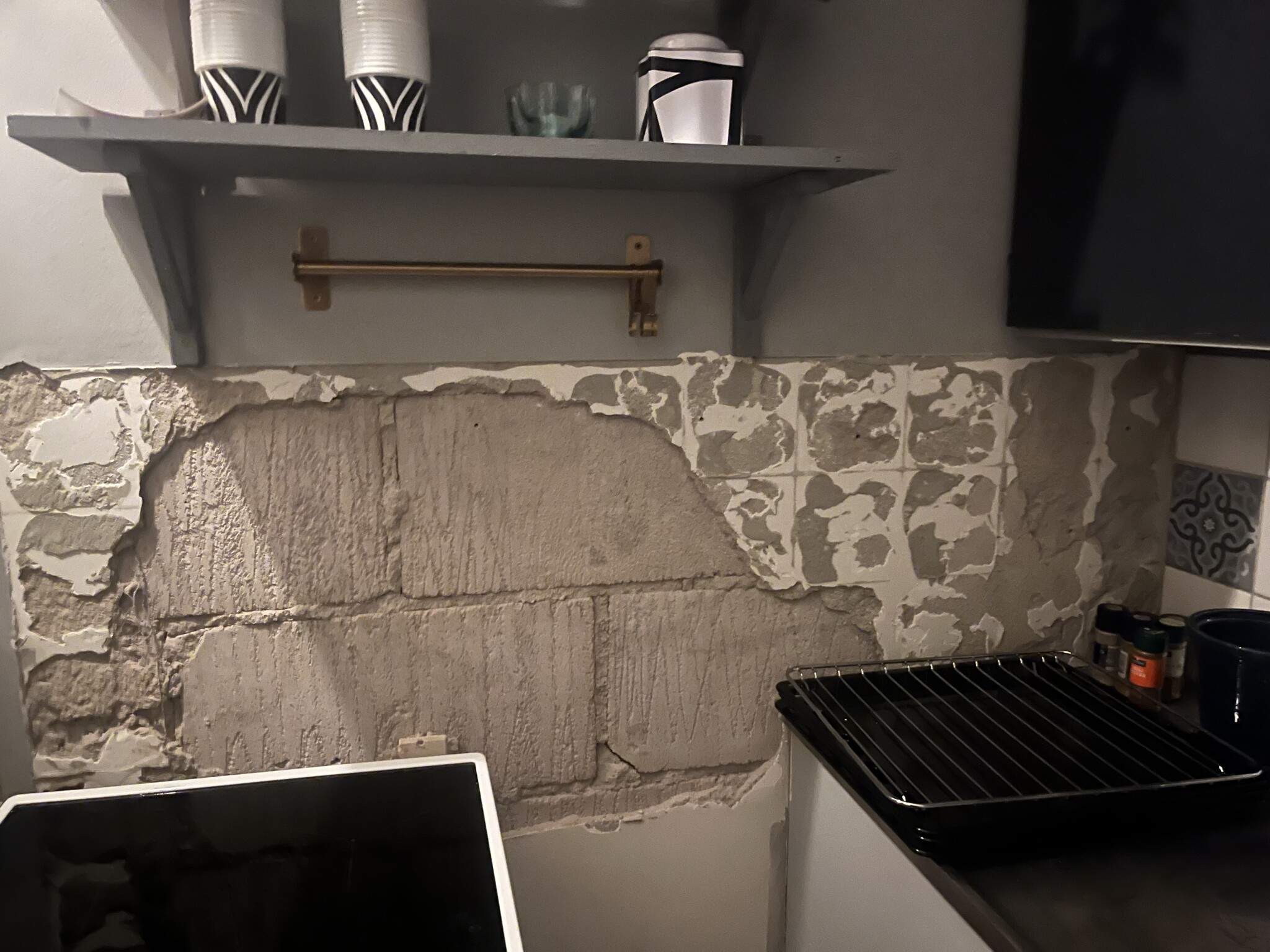 Hej! Har rivit ner kakel i kök. Satt fast rejält och bitar av väggen följde med som synes. Planen är att ha en vanlig målad vägg och stenskiva med kant en bit upp på väggen. Gipsplatta? Spackla/bygga på befintligt ”hål”? Annat? Tack på förhand!!