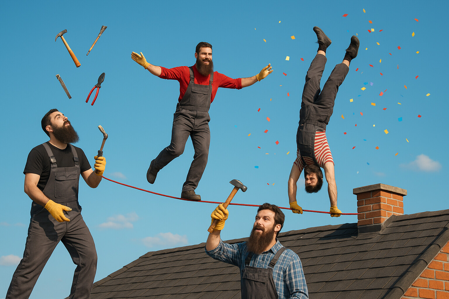Jag frågade Ai om den kunde göra några fler bilder på Tomas Andersson när han jobbar på taket. Men han sa att han inte kunde efterlikna en riktig person. Men när jag förklarade att Tomas Andersson var Ai ritad så kunde han det.