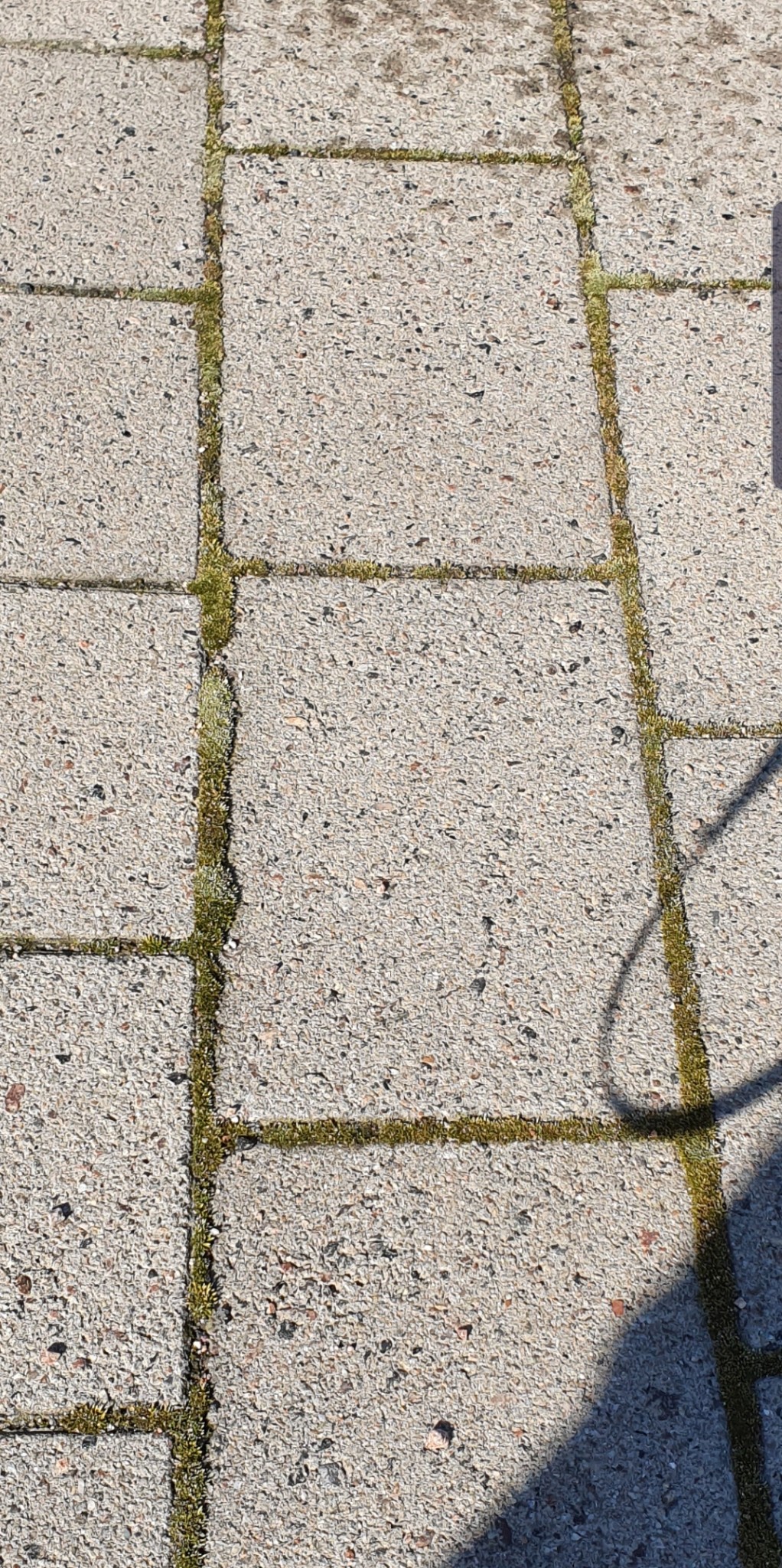 Varför i hela friden ska du ta bort den vackra mosskanten? Det är ju precis det där som vi landskapsarkitekter drömmer om. Inget ogräs bara vacker mossa. OM du nu ska ha bort det får du väl skrapa mellan fogarna och sedan fylla på med ny sand. Ett uttjänt smalt stämjärn funkar bra, om du vill böja dig, annars kan du ta ett kvastskaft och slå in en spik med ett huvud i lagom dimension och krafsa med det. Men som sagt, jag förstår inte varför.
