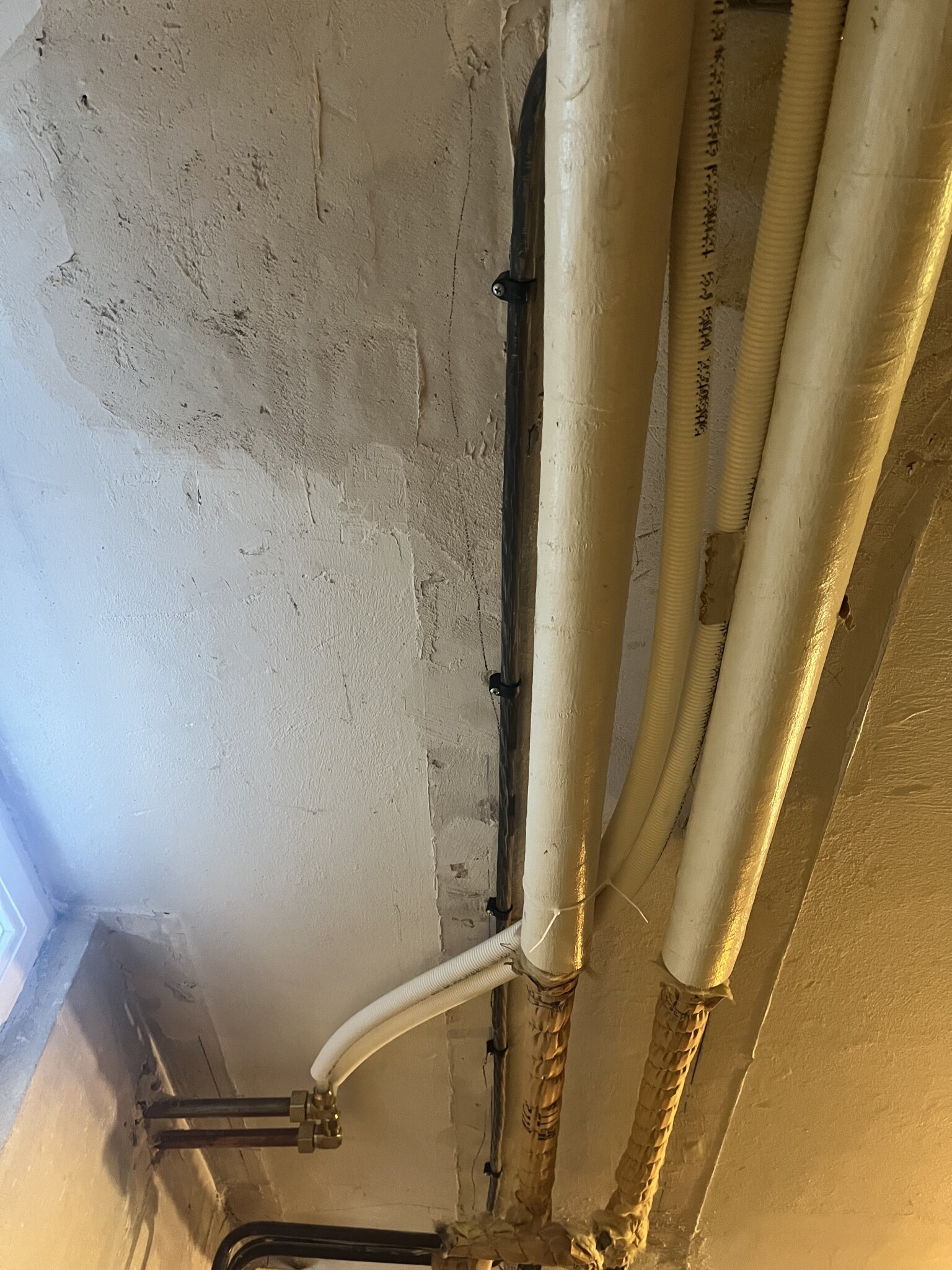 I dagsläget finns en koppling för varmvatten (VV) och en för kallvatten (KV) till den nuvarande blandaren, som ska tas bort. Dessa kopplingar sitter ganska nära taket, och jag har cirka 6,5 cm synligt kopparrör mellan tak och anslutning.