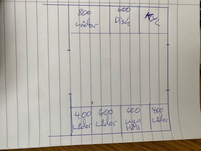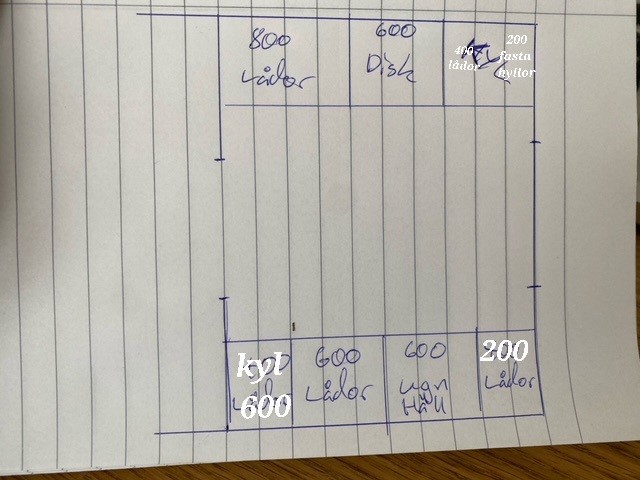 Kyl/frys hamnar precis bredvid diskho och det blir inget utrymme över att sätta någon avskärmning mellan ho och kyl. Sedan hamnat kyl/frys precis bredvid en sidovägg. En fönsterbräda och fönsterfoder ställer även till det lite extra, dvs frysdörren kommer ej att gå att öppna 90 grader. (Fast man kan så klart göra om foder och fönsterbräda).