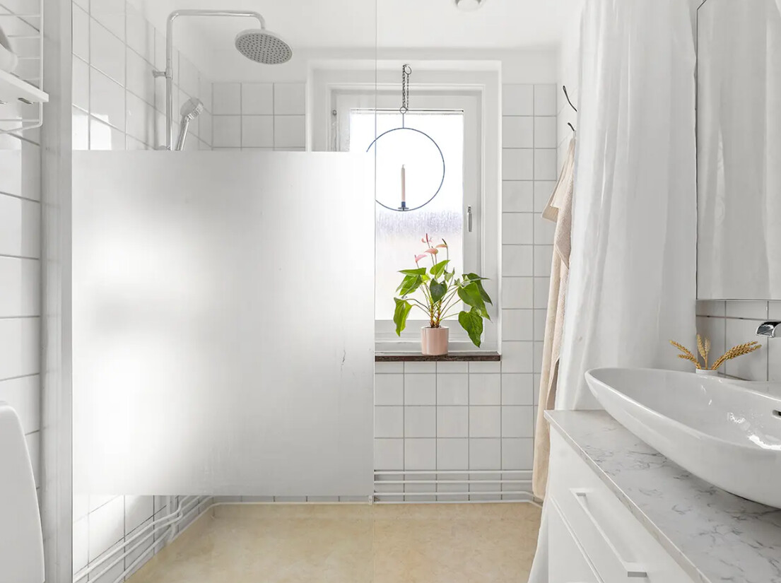Sen är det ju inget som hindrar att man drar ner en skyddande rullgardin över fönsternischen, när man duschar.