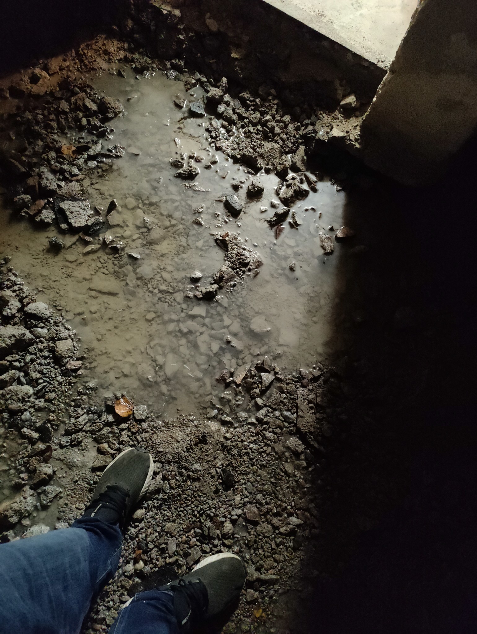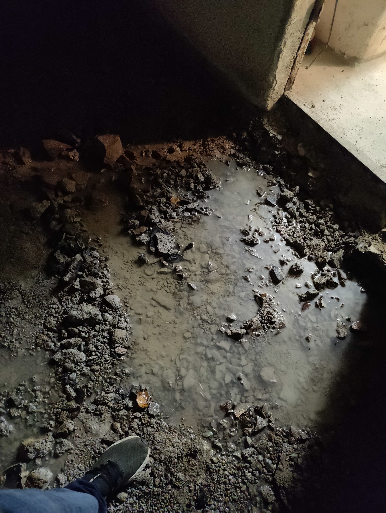 Då visar det sig när cementen är borta att vatten trycker upp ur golvet.