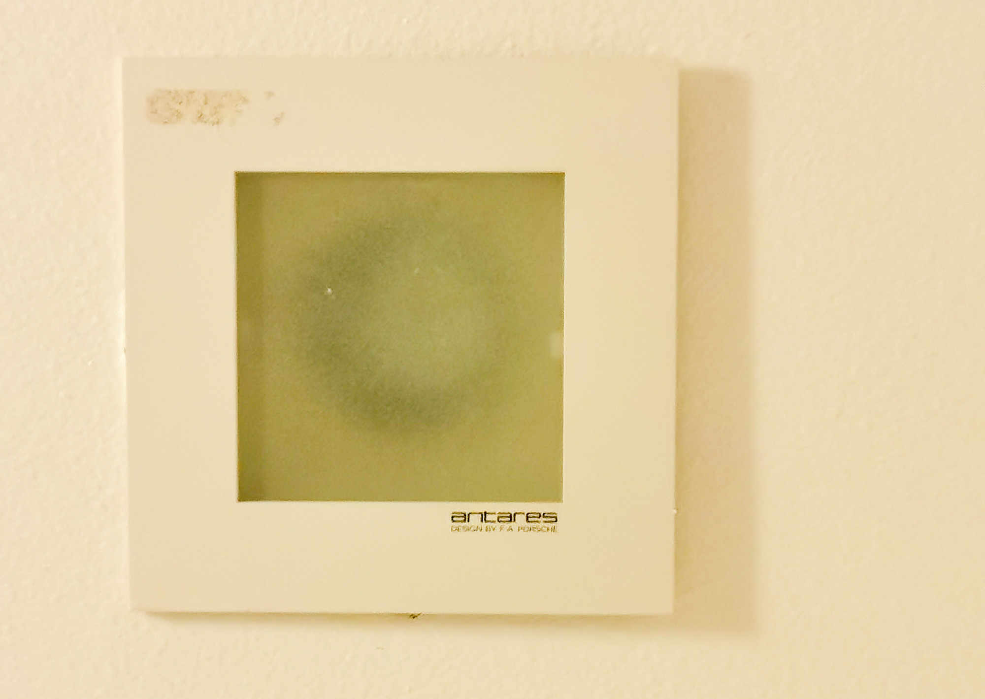 Någon som vågar sig på en gissning på hur tusan jag kommer in i denna? Inbyggd i vårt badrumstak. Antares Design by Porsche står det på ramen. Hittar ingen fjäder eller någonting, jag vet att det ser ut att vara något snett nedanför texten men det är bara en skada/märke i taket.