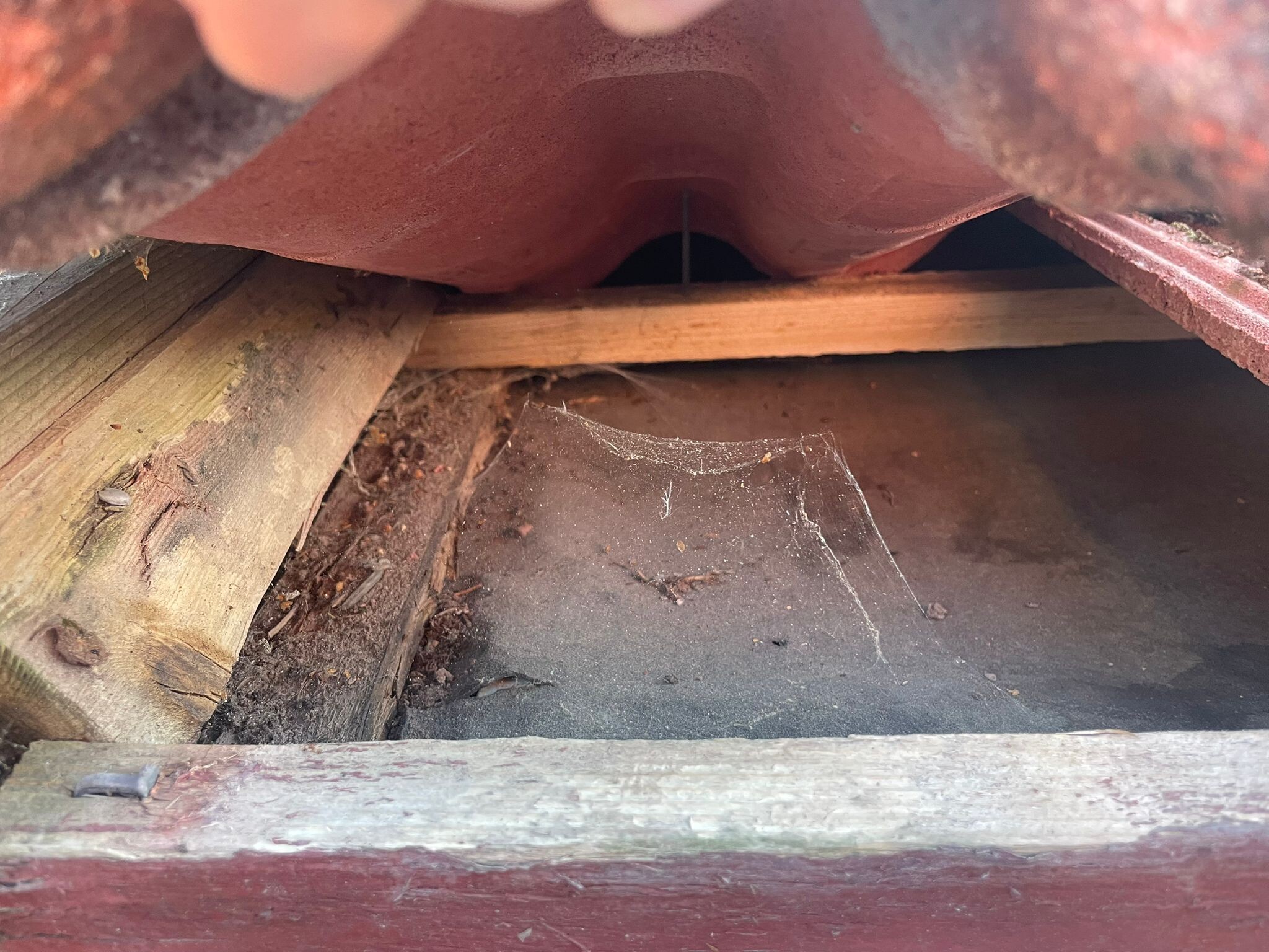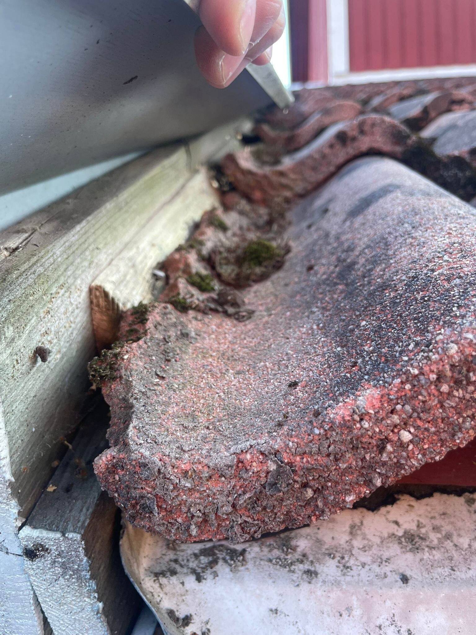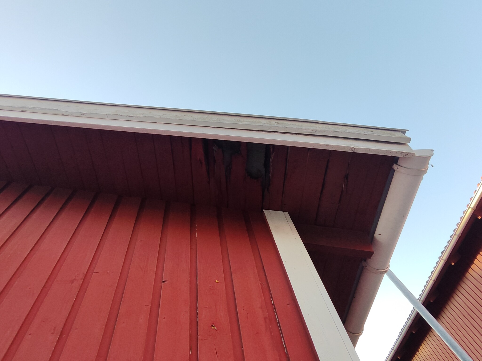 Hej! Radhus byggt -81 där det tyvärr har fuskat vid bygget på sina håll. Här har inte pappen vikts upp mot trekantslisten så regnvatten har letat sig under och skadat hela det utskjutande partiet.