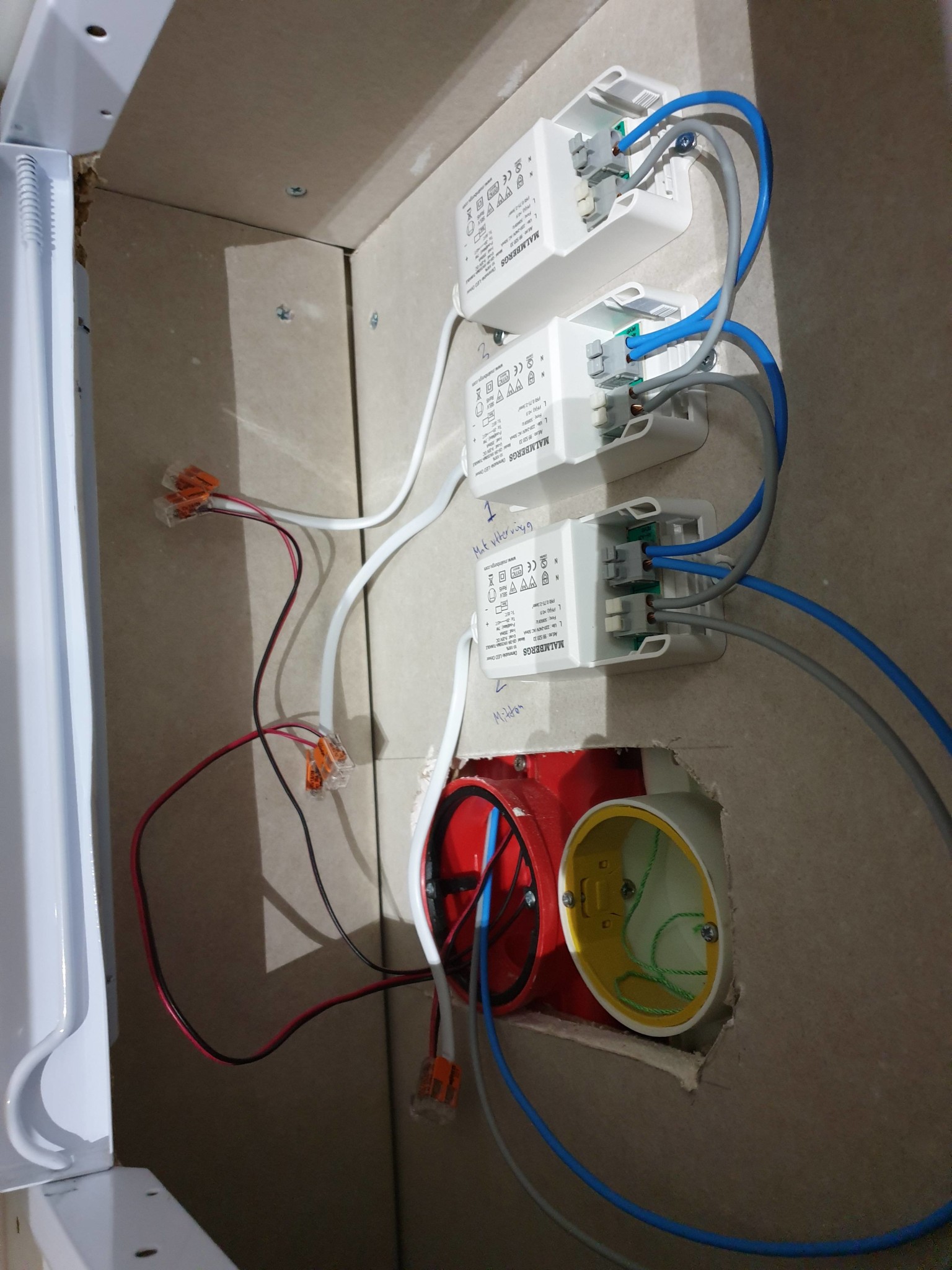 Det är precis det som är fördelen med dagens LED - de tillåtet ett längre avstånd mellan drivdon och lampor. Det ger möjlighet till att ordna en fin plats för drivdonen. Det innefattar separata rör för 230 V och klenspänning och nödvändig isolation i kopplingsutrymmet. Installationen på bild behöver förbättras, det får inte se ut så där.