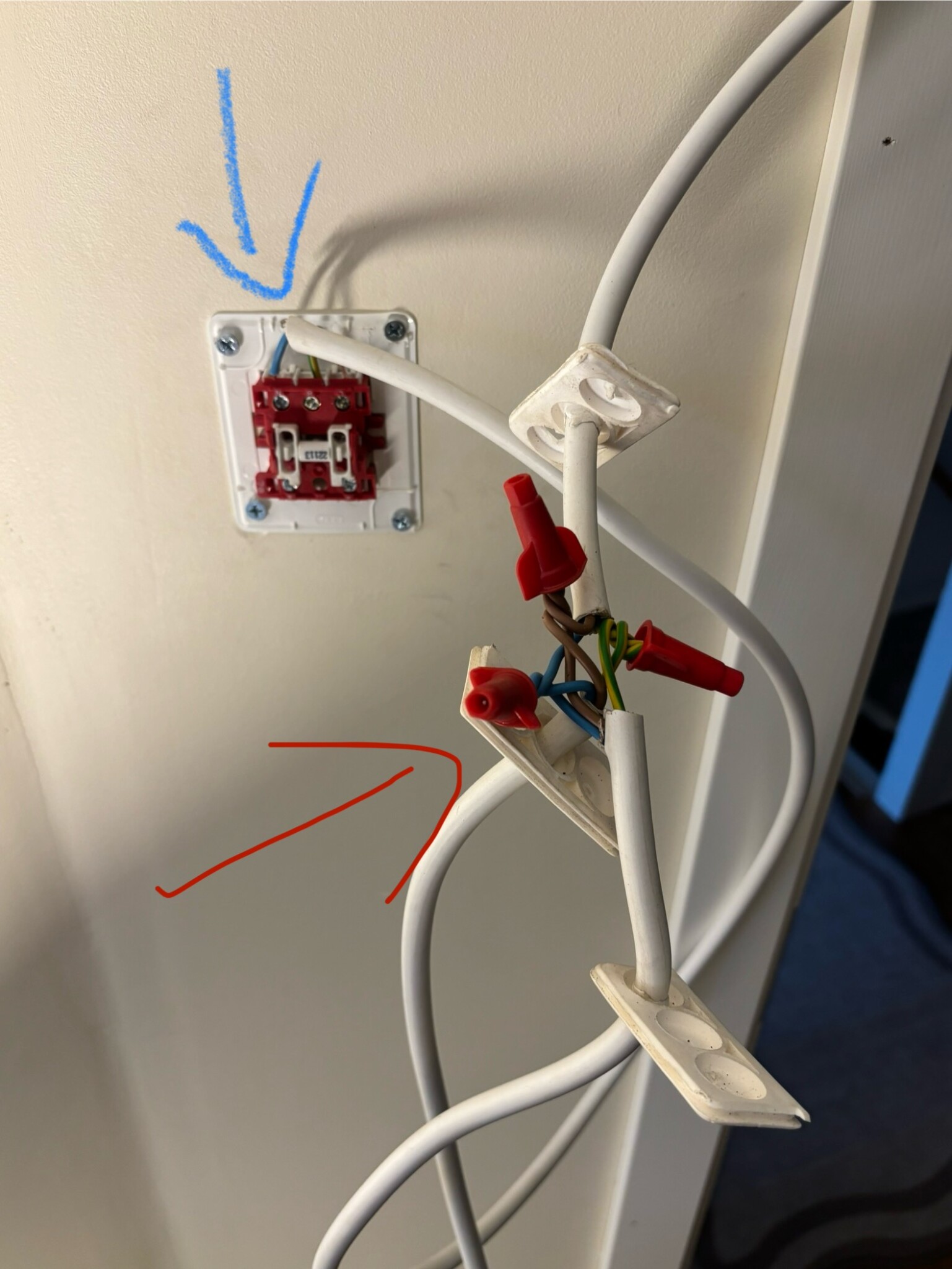 nu har jag fixat rätt kabel röd pil är hur det är kopplat i kopplingadosan och den blåa pilen hur det är kopplat i strömbrytaren , någon som vet vad som inte stämmer ?