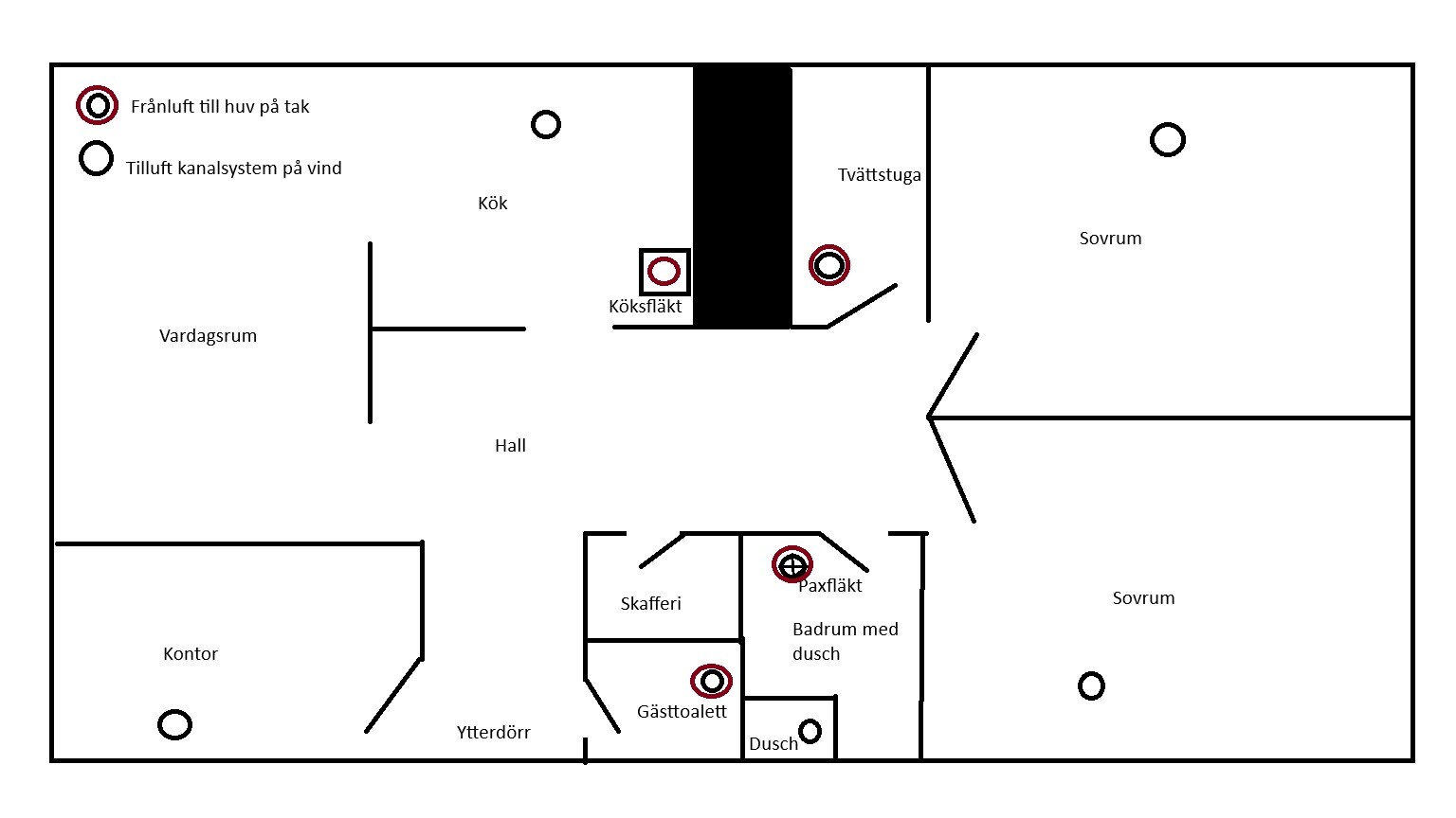 Jag har ritat en överblick på huset där jag har ett kanalsystem på vinden, vad exakt som har suttit där vet jag inte men jag tänker att jag kan använda och bygga om efter behov. Då blir det tilluft enligt ritning i Sovrum 1 & 2, vardagsrum/kök och kontor. Min fundering här är främst om det är för lite tilluft gentemot frånluft, då det sitter i stora badrum (dock med paxfläkt i nuläget) gästtoaletten och tvättstuga.