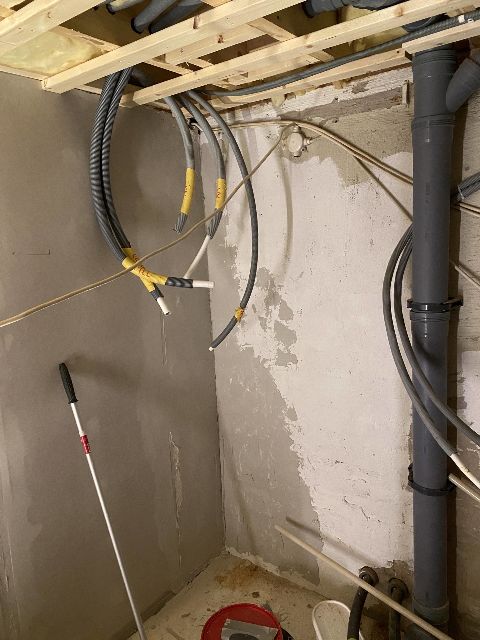 Förbereder för bergvärmepump och ett antal rör kommer nu ner från badrummet ovanför samt fördelarskåp till golvvärme på övervåningen.