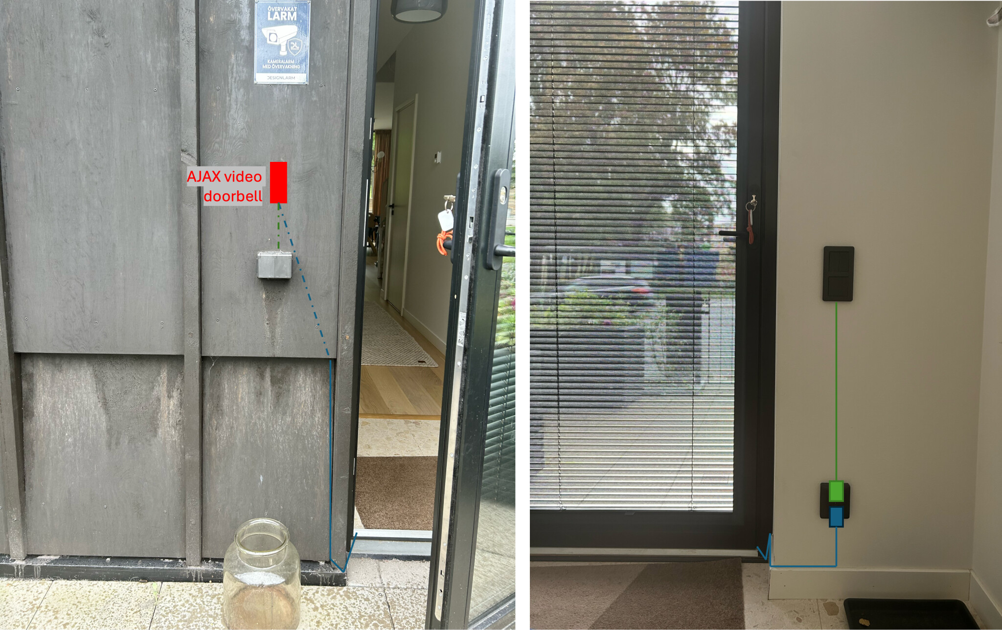 Blå - mycket synlig kabel som går under dörren och ut. Och sedan bakom panelen (streckad linje) och in i dörrklockan.