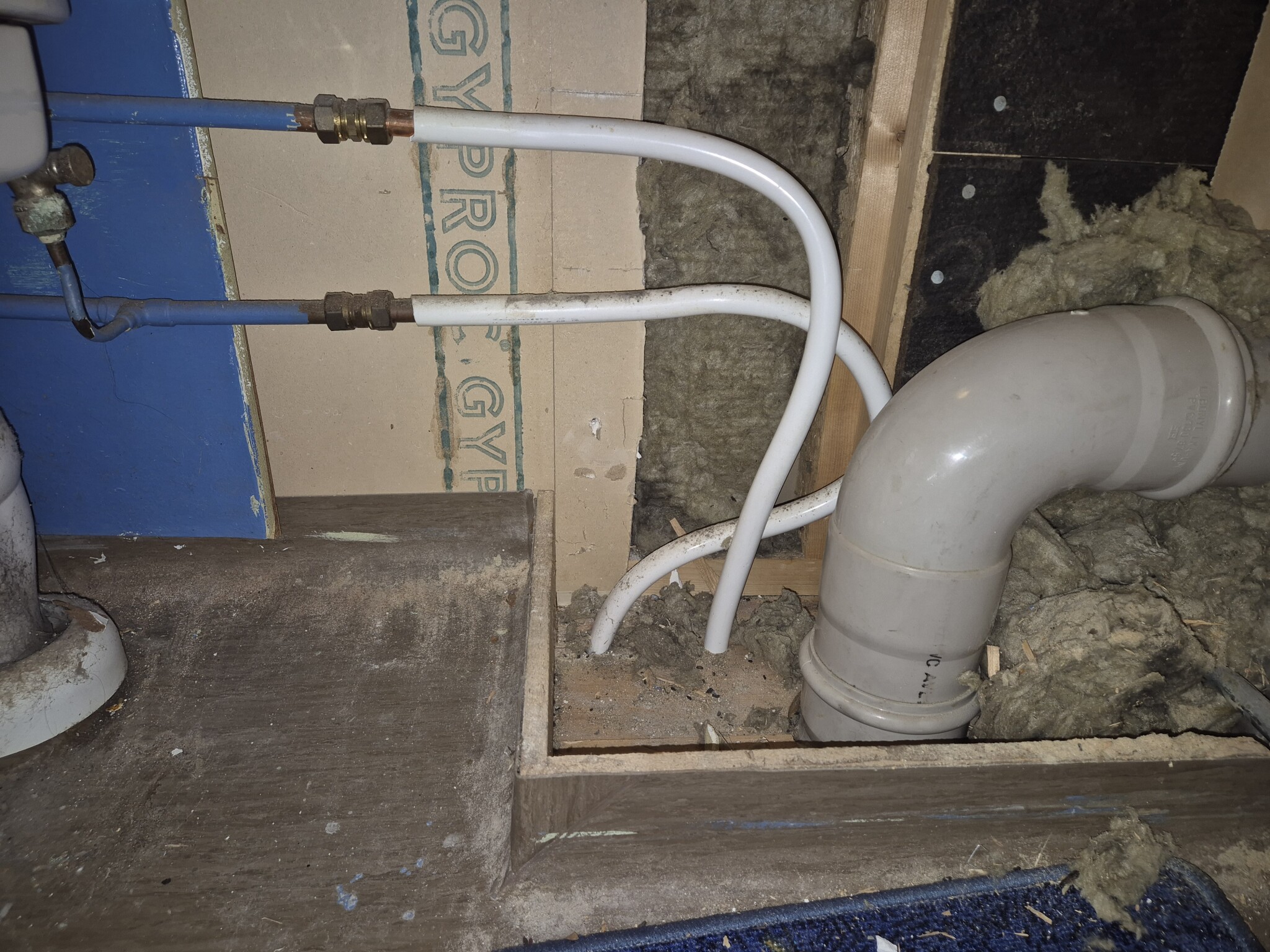 Vit avloppsrör i golvnivå med två vita vattenrör och isolering i ett badrumsrenoveringsprojekt.