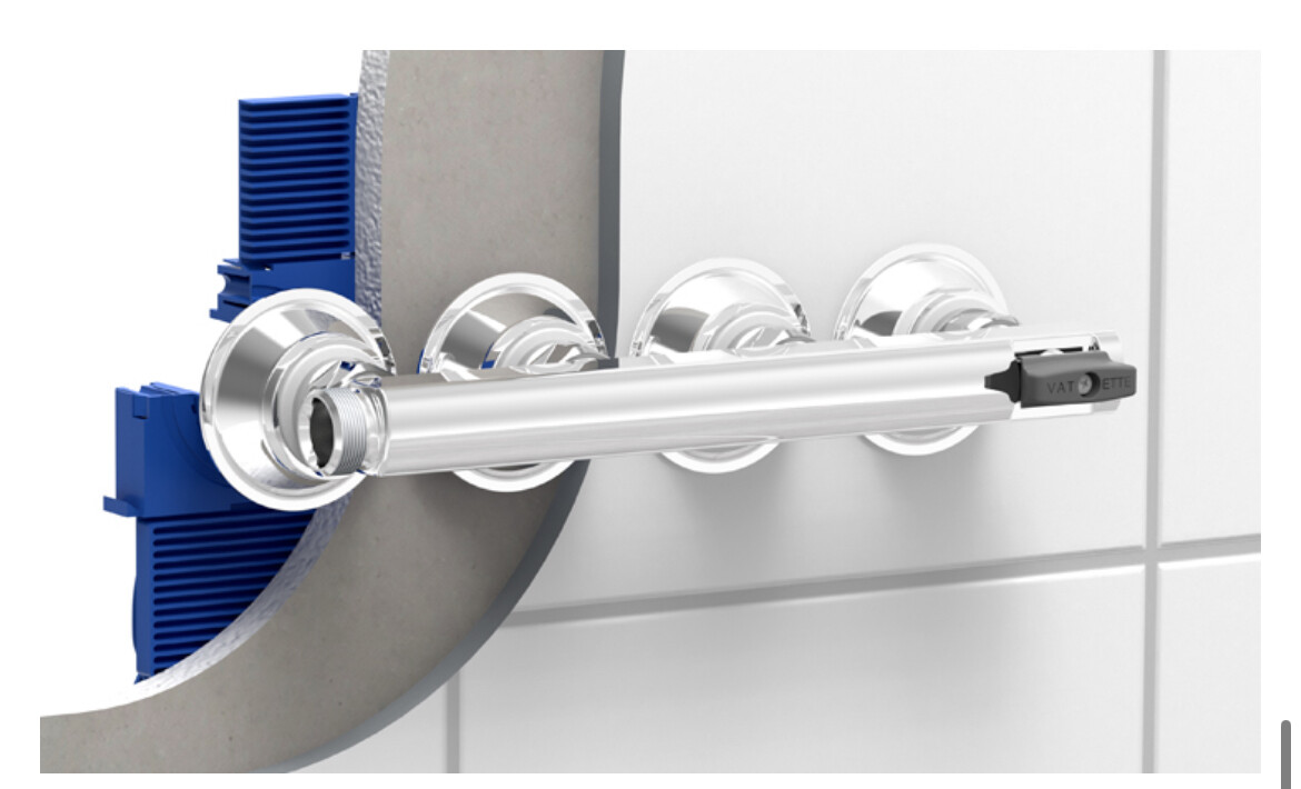 Byggsystem Vatette V6 installationslösning där kopplingar är monterade utanpå väggen för enkel läckagedetektion i badrumsbyggnation.