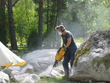 Bergknallen, som det först såg ut som visade sig att va ett område på ca. 10-12 kvm när man lyfte på tuvorna och var en relativt flat kulle som vilken badplats som helst hade velat kunna stoltsera med som "soldäck". Hålen borrades, efter lite övning och förnedring med att läsa instruktionsboken en gång till, snett. Eftersom Cobran var som sänd av djävulen klarade den inte att rotera ens med sin egenvikt som belastning så det var ett hästgöra att lyfta och borra samtidigt. Ner i hålet singlades sen skottet som såg ut som en hagelpatron. När självförtroendet steg så åkte det ner två åt gången.