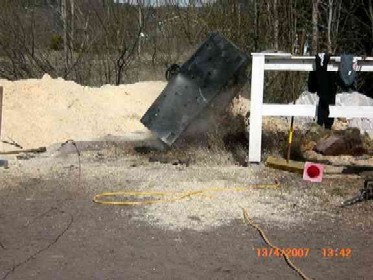 Kontrollen på sten som sköts loss kändes ganska bra. Så länge man såg till att gummimattan låg nere på backen utan att skapa några öppningar åt nått håll så var spridningen av större sten begränsad. Det skramlade i och för sig på plåttaken omkring oss ibland så den nylackerade bilen flyttades. Sköt man däremot loss en bit där ena sidan biten redan var lossad så att säga så fick kraften fri verkan åt det hållet. Det kunde man ganska enkelt rikta åt det hållet man ville och tur var väl det för stenblock i 60-70 kilosklassen studsade lätt iväg 15 meter efter 6-7 meters lufttur.