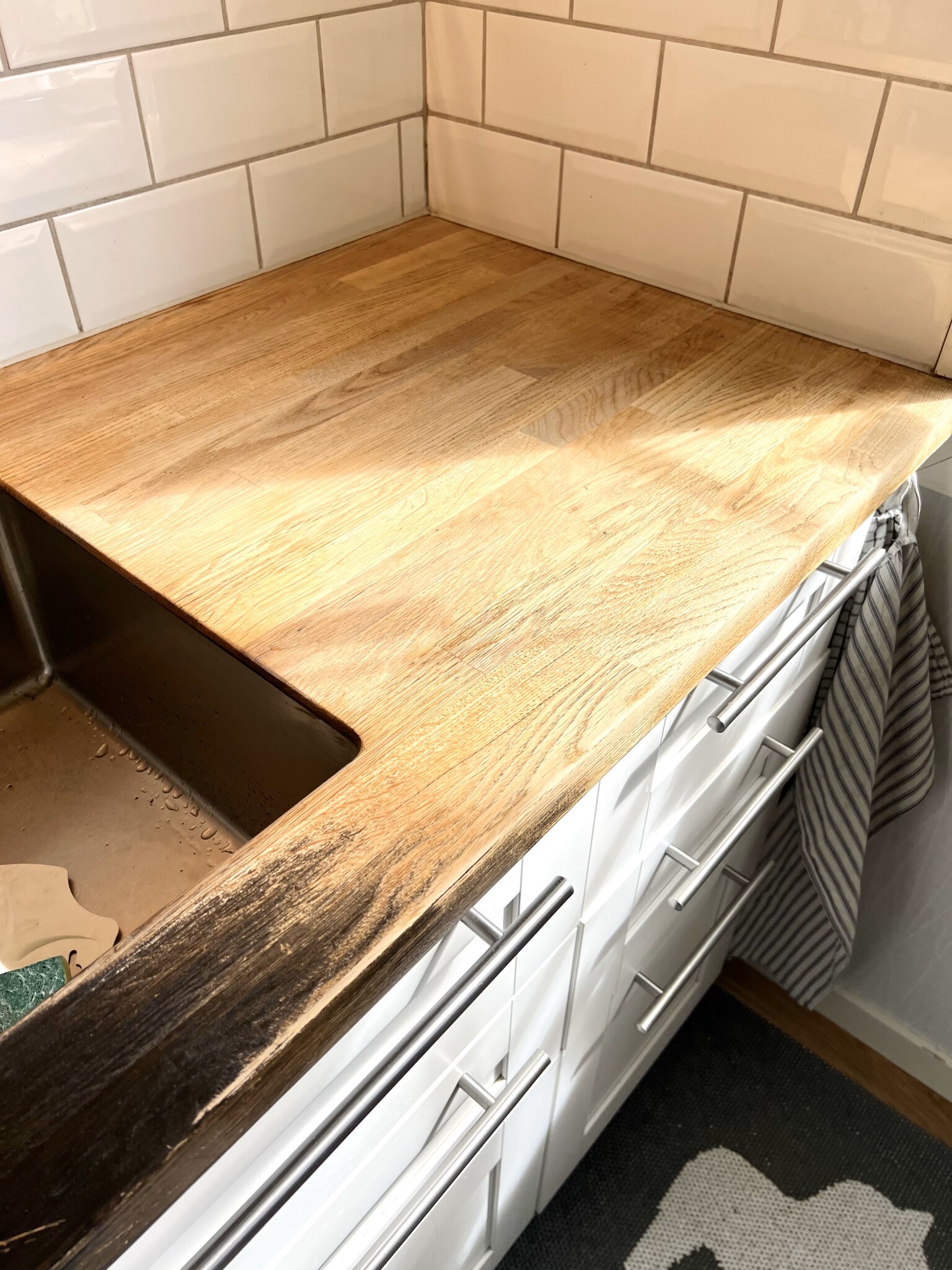 Får något år sedan så oljade vi in vår köksbänk (ek) med en mörk pigmenterad olja för att förändra lite i köket.