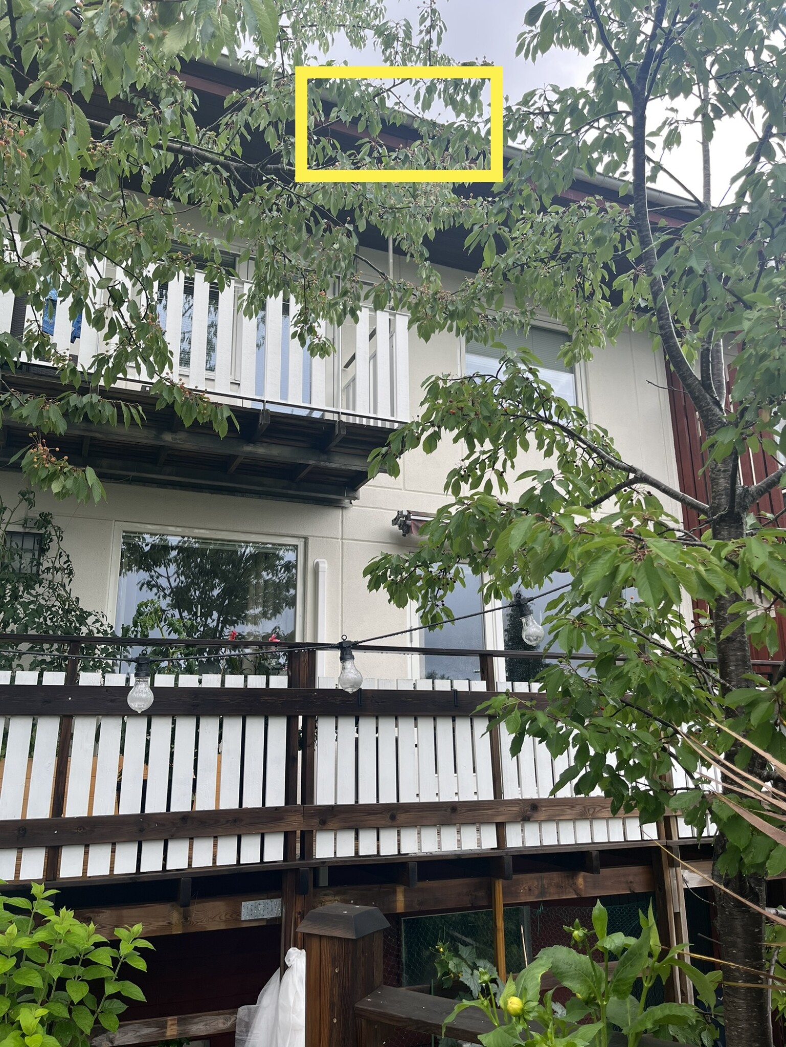Jag har stopp i en av takrännorna och det sitter så pass högt upp att jag inte når. (Den gula markeringen visar vart vattnet rinner över)