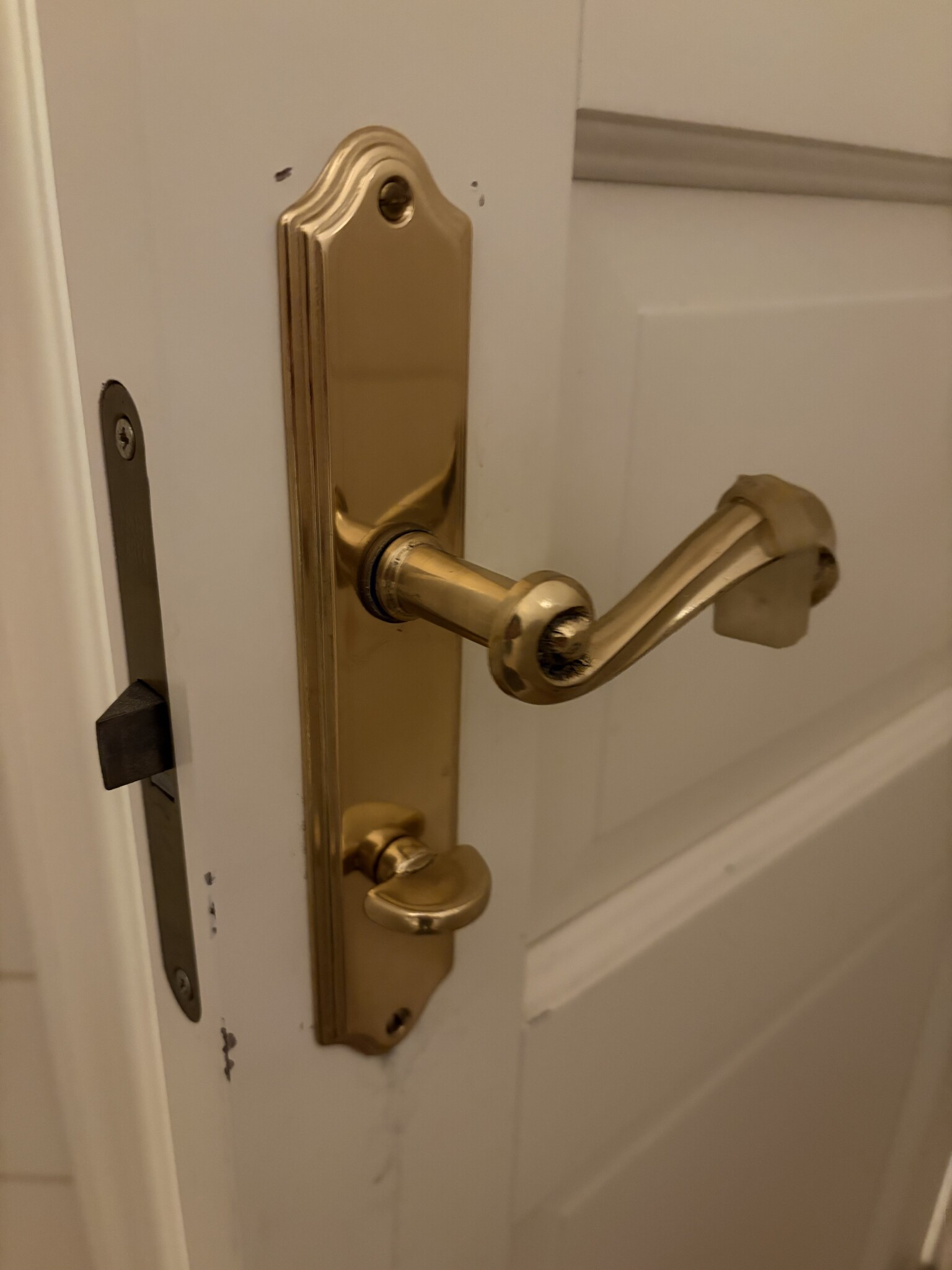 Jag skall montera bort handtag, vred mm från en äldre toalettdörr som skall målas, handtagen är inga problem men när jag kommer till vredet tar det stopp, det finns ingen skruv eller liknande som håller det på plats, testat att dra och bända men det rubbas inte, vet inte hur hårt jag vågar ta i, vill inte förstöra det, har ni några tips?