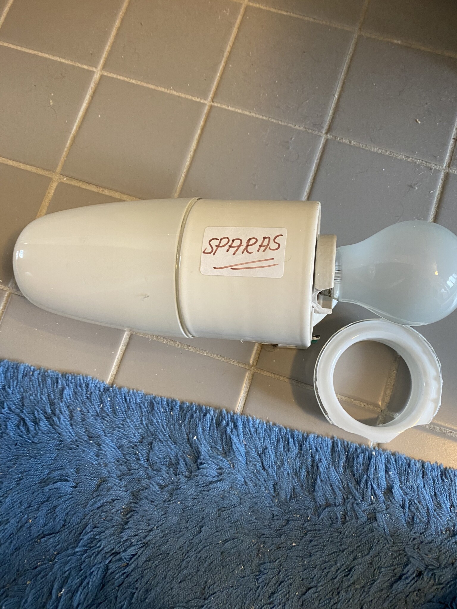 Reservglas finns till många gamla badrumslampor men med foten är det nog värre, men kolla om det är något som passar.