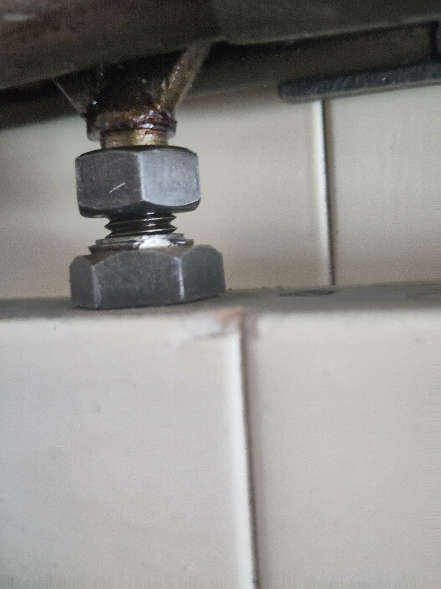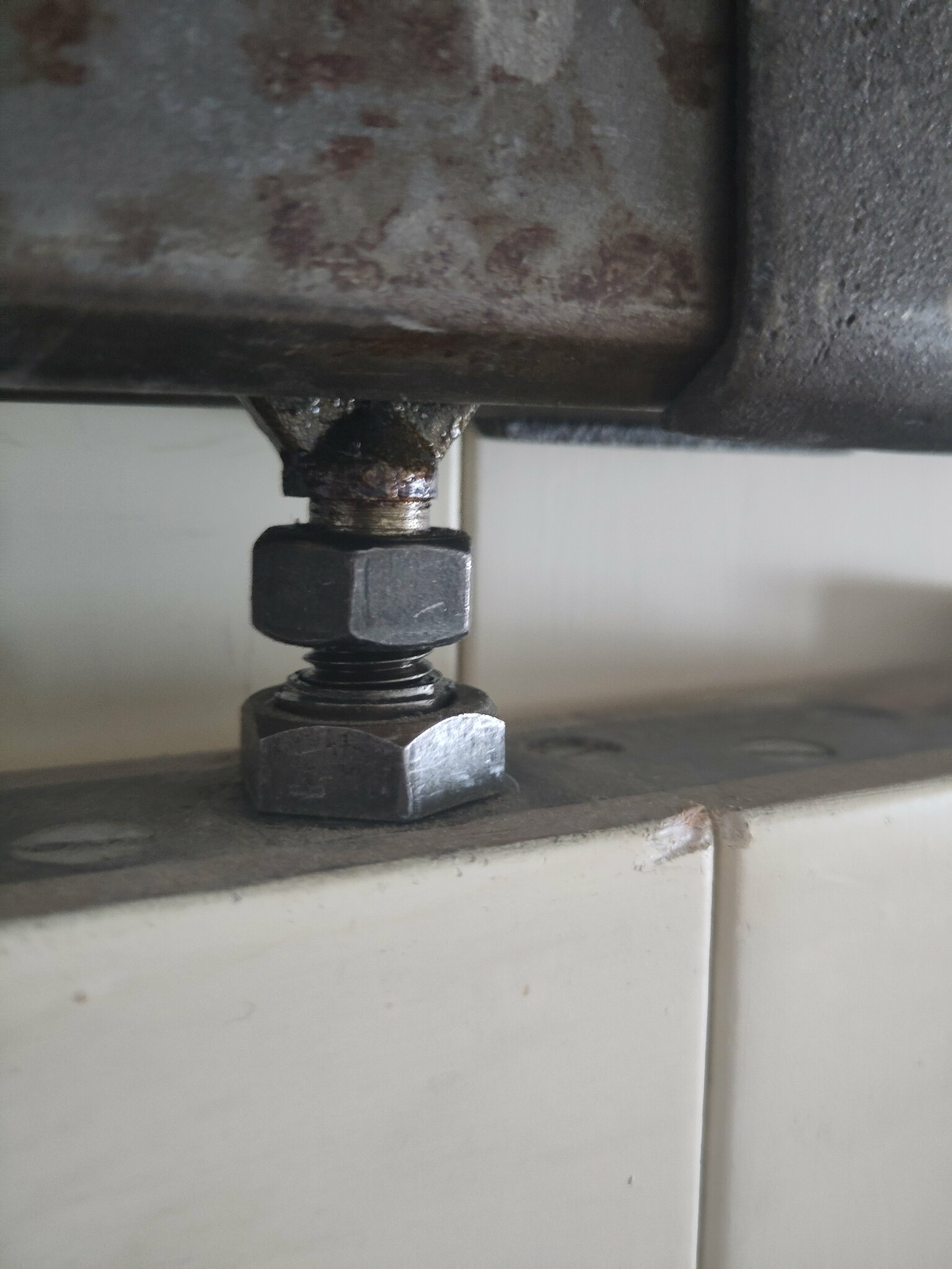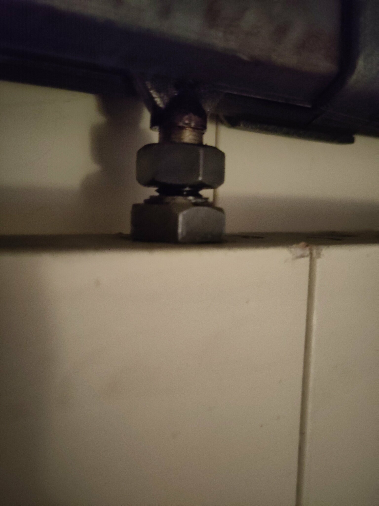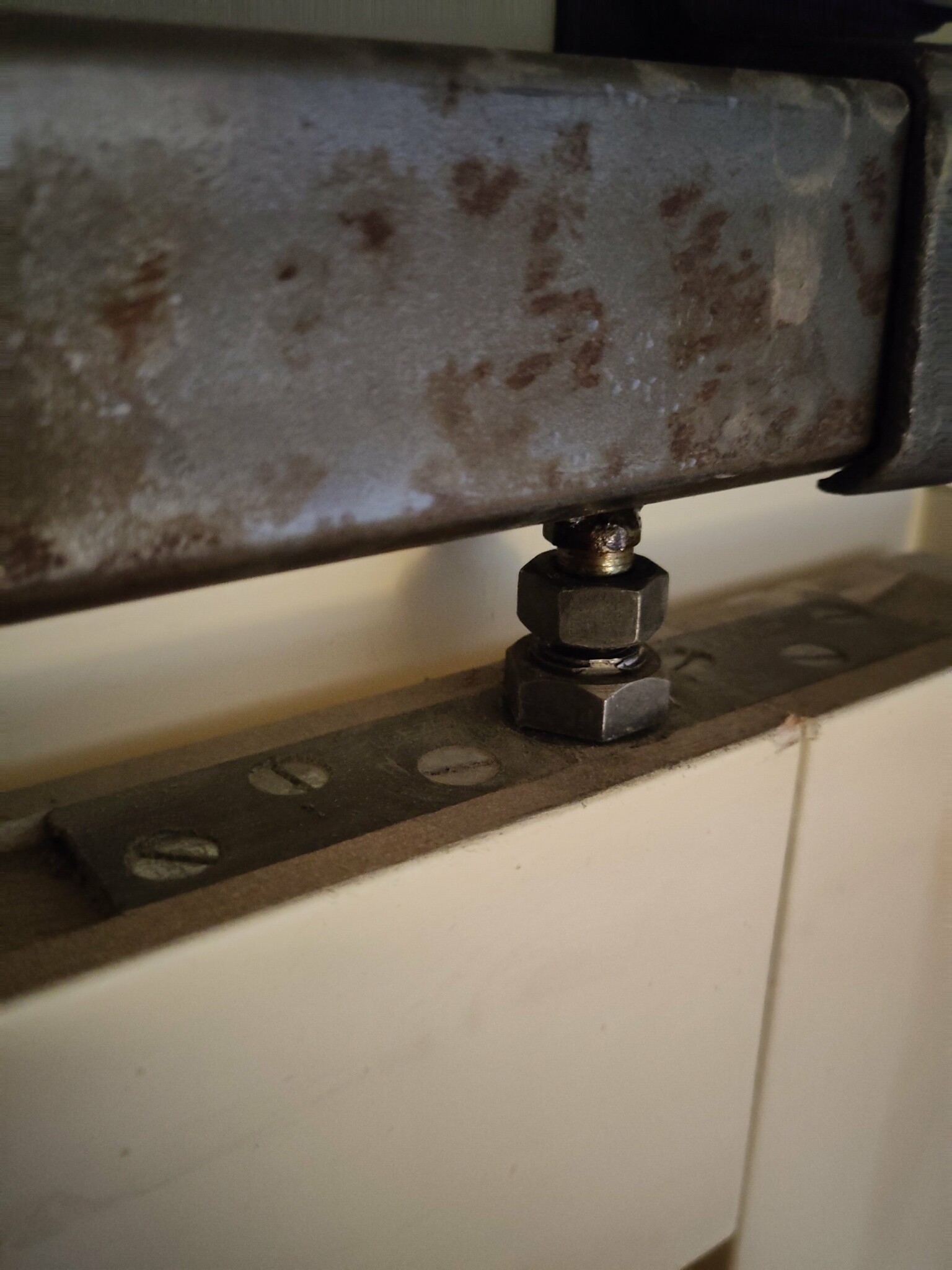 Kompletterar med två bilder. Den understa muttern består av en yttre och en inre del. Den yttre delen sitter lite löst på den inre, den kan röras lite (någon mm) åt sidorna och lite uppåt. Den inre delen är avfasad på två motstående sidor. Vrids den yttre muttern mot höger så följer även den inre delen med. De följer gängorna "uppåt" och lyfter dörren. Åt andra hållet sänks dörren. Vilken funktion har avfasningen av den inre delen? Nedtill borde den inre delen hållas fast av bläcket på dörrens ovansida så att den lyfter bläcket och därmed dörren när den vrids på gängorna, men hur fick de dit muttern? Kanske sattes den dit när de skruvade fast bläcket. Man kan tänka sig att de satte dit bulten med tillhörande rullhjul när de skruvade fast skenan i väggen. För att nu få loss bulten måste skenan lossas från väggen eftersom hjulen tar stopp i skenan när de trycks uppåt. Hoppas därför på att avfasningen ska vara en alternativ lösning.