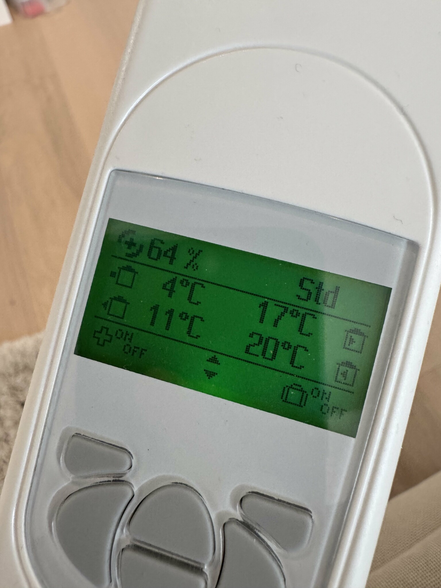 Såhär ser det ut på fjärrkontrollen till ventilationen, inställd på 24grader nu, vet inte hur det ”bör” se ut & om allt ser okej ut? Eller vad den säger mig eg? Mer än att det står ”system ok” på displayen. Och exakt hur dessa tre system påverkar varandra.