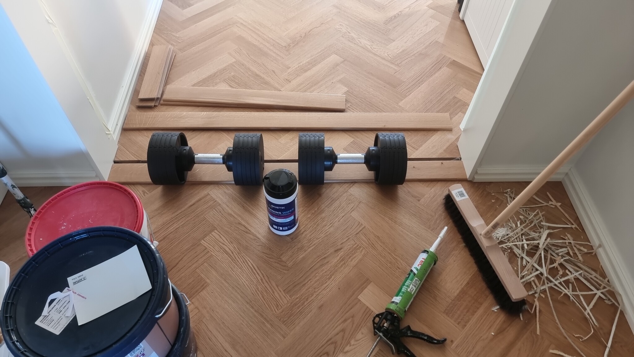 Försöker runda av renoveringen av min lägenhet och försöker lista ut vad som är bästa eller åtminståne ett bra nog sätt att fästa två tröskelplattor vid en övergång med nivåskillnad.