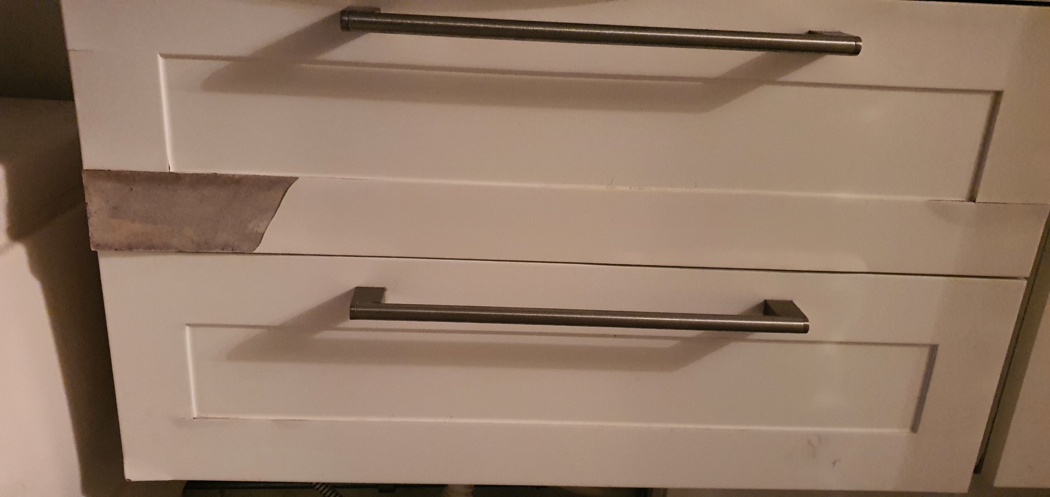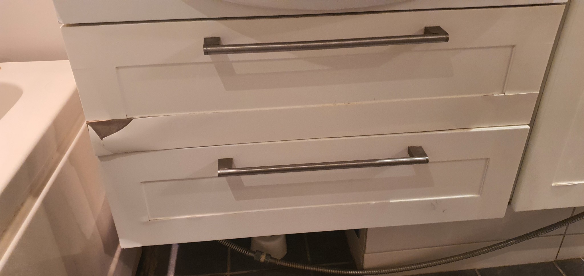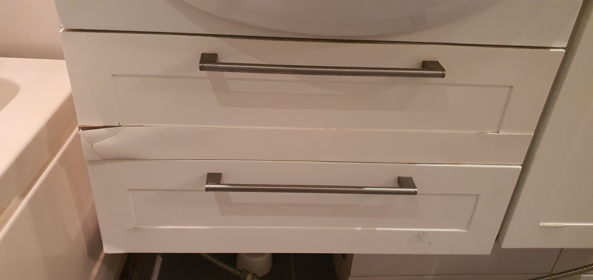 Ytan på draget under tvättstället ser ut som den skada du ser på bilden. Vet inte vilket märke det är och jag förstår inte heller vilket material det är? Det ser inte ut som melamin (eller kanske jag har fel.) Letar efter en snabb, billig snabb fix.