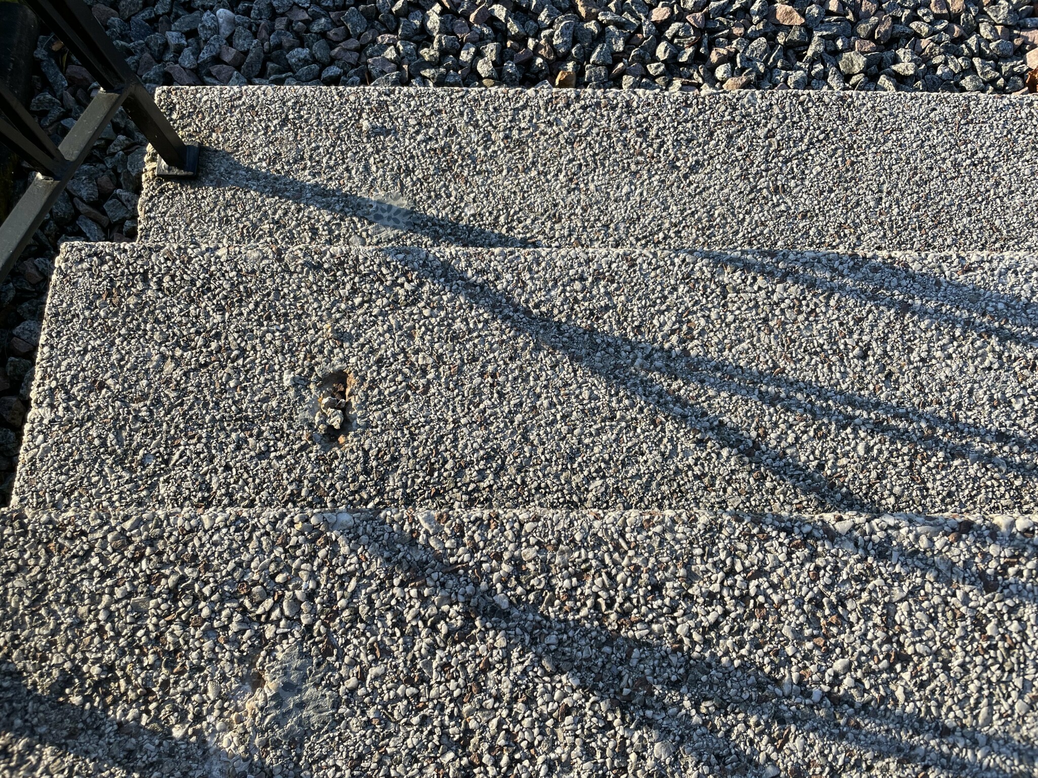 Huset från 1968 har en gjuten trapp till entrén med sten som dekor i ytskiktet. Skador har uppkommit vid armeringen med åren. Hoppas bilderna förklarar. Hur ska jag gå till väga för att snygga till den?