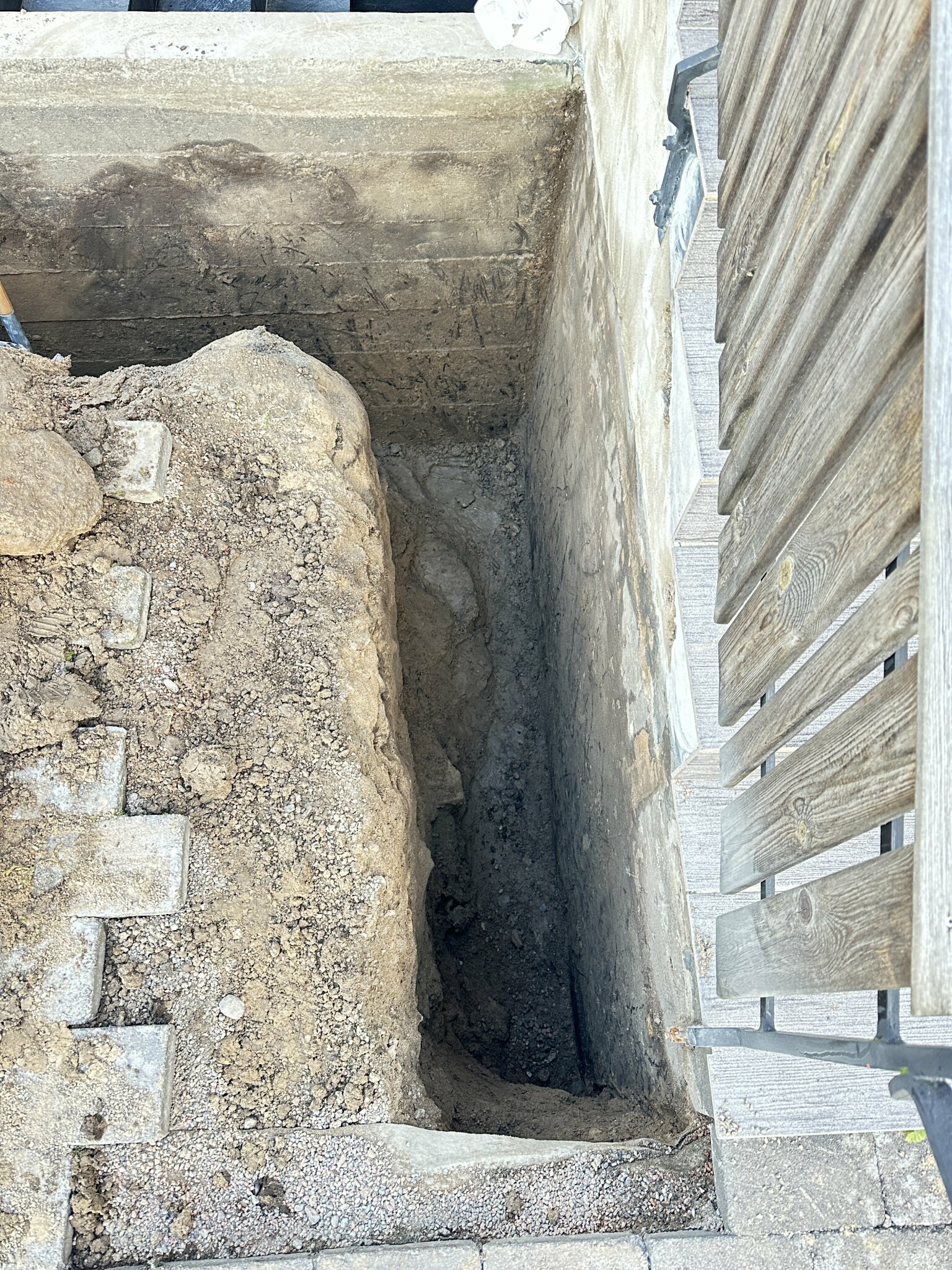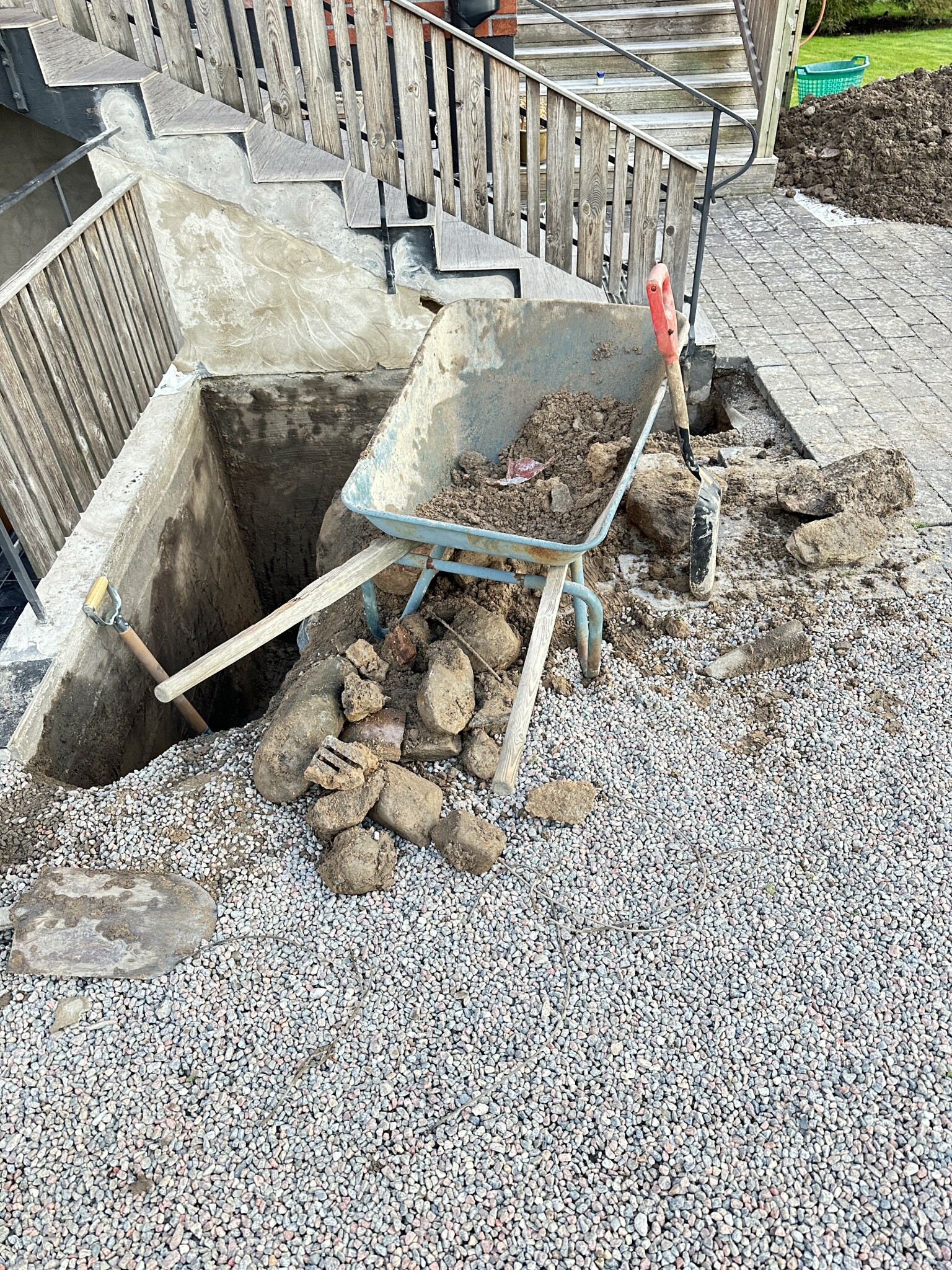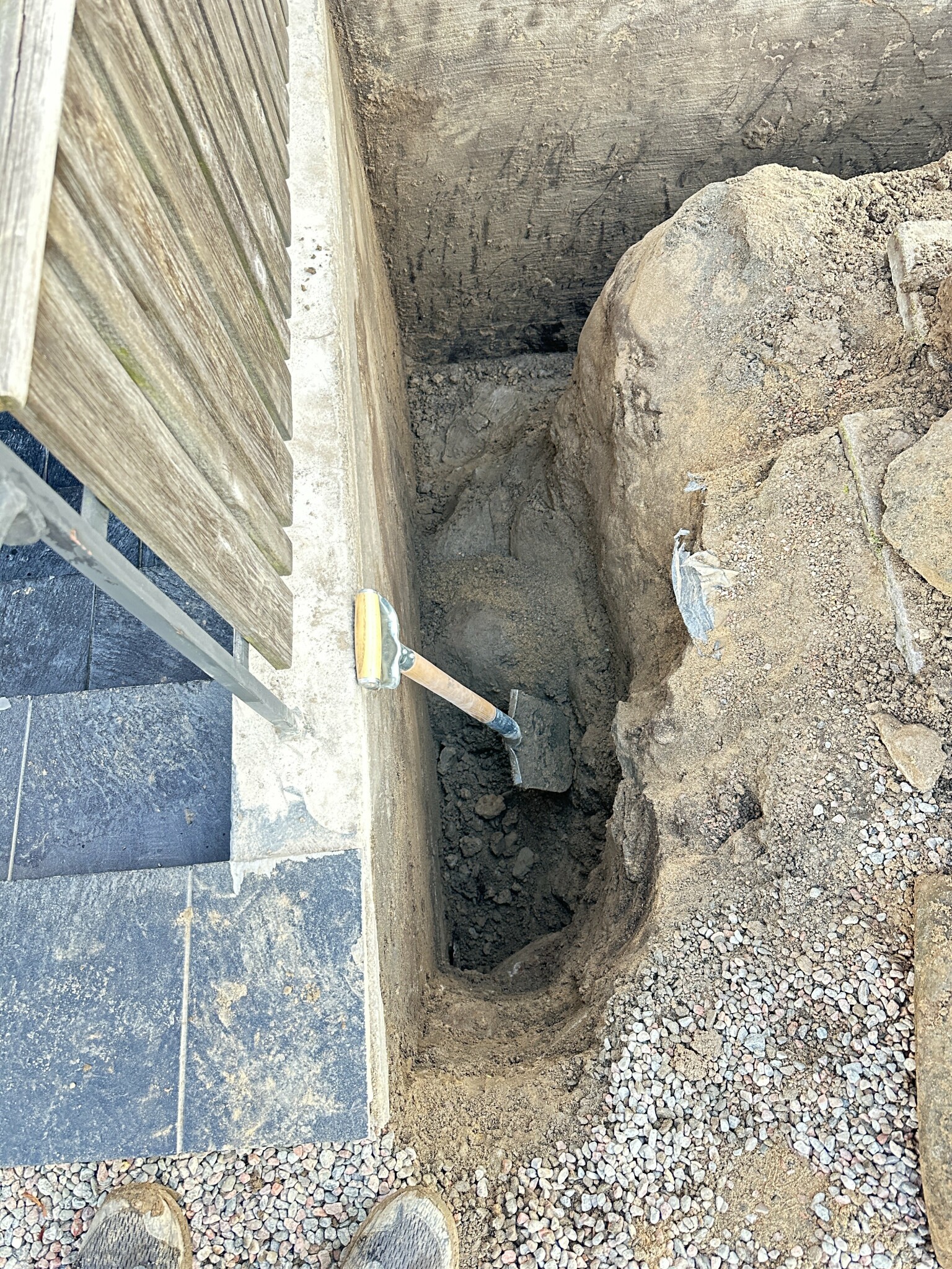 Nu är det utgrävt. Vid ena väggen är det berg i nederkant i mitten av väggen. Hur gör man med dräneringsrör i det fallet? Jag har för övrigt ingenstans att göra av vattnet än att leda röret bort från huset en liten bit.